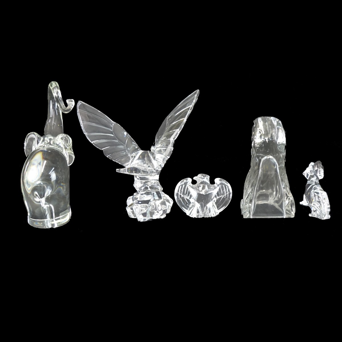 Grouping of Five (5) Vintage Animal Figurines. Includes a Val St. Lambert crystal bird, Oggetti Murano glass elephant, Baccarat crystal dachshund, Steuben crystal eagle, and a unsigned glass eagle figure. Tallest measures 9-1/2' H, smallest 3-1/2" W. Condition: Steuben figurine has some chips to the base otherwise good condition Estimate: $100.00 - $300.00 Domestic Shipping: $88.00