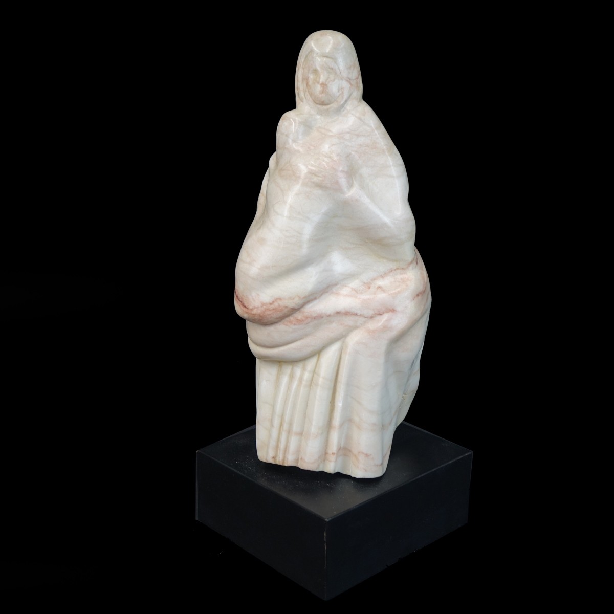 John Rocker Marble Sculpture of a Mother and Child Mounted on Wooden Base. Signed Rocker. Sculpture measures 11" H x 5-1/4" W, overall measures 13-1/8" H. Condition: Good condition Estimate: $100.00 - $200.00 Domestic Shipping: $78.00