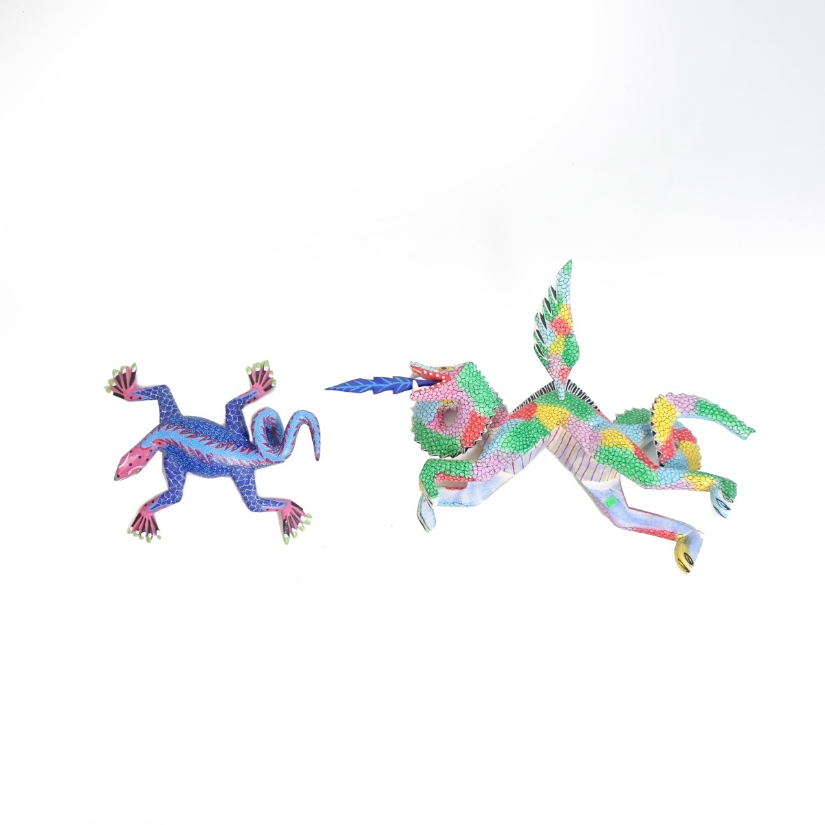 Two (2) Vicente Hernandez Vasquez Polychrome Folk Art Figurines. Each marked on the bottom side. Dragon measures 17", lizard measures 2-1/2" x 9". Condition: Dragon is missing a wing and a tooth otherwise good condition Estimate: $100.00 - $300.00 Domestic Shipping: $78.00