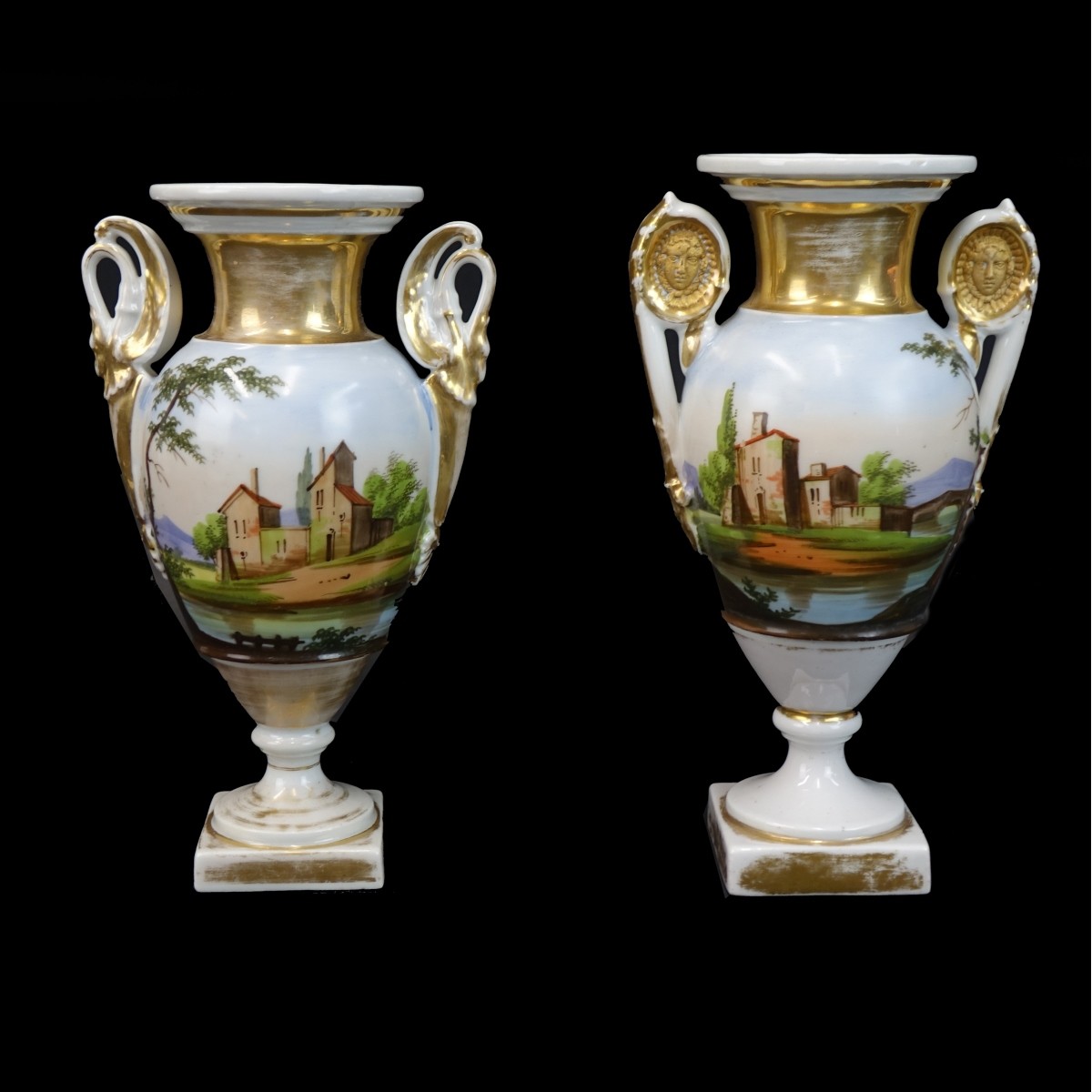 Lot of Two (2) Old Paris Gilded Porcelain Vases. Unmarked. Landscape scenes encircling the center and formed handles. Tallest measures 10" H, other measures 9-1/2" H. Condition: Heavy rubbing to the gilded surface otherwise good condition Estimate: $50.00 - $100.00 Domestic Shipping: $68.00
