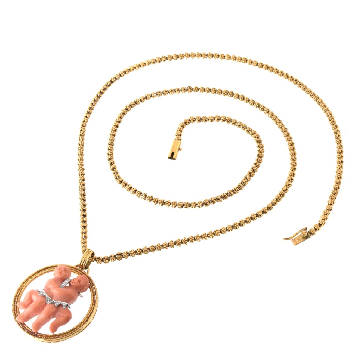 Vintage Carved Coral, Diamond and 18 Karat Yellow Gold Pendant with 20 Karat Yellow Gold Chain. Pendant stamped 750 and hallmark, chain clasp with hallmarks. Pendant measures 1-5/8" L, 1-3/8" W. Approx. total weight: 51.15 grams. Condition: Very good vintage condition. Estimate: $3500.00 - $4500.00 Domestic Shipping: $32.00