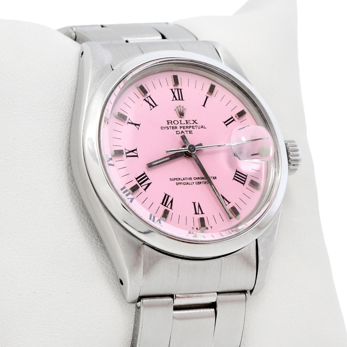 Vintage Rolex Date Ref. 1500 Stainless Steel Oyster Bracelet Watch with Automatic Self-winding Movement. Pink dial and Roman numerals. Case measures 34mm. No box or papers. Condition: Very good pre-owned condition. Please note the gallery does not warranty the running condition of watches. Estimate: $3000.00 - $5000.00 Domestic Shipping: $32.00