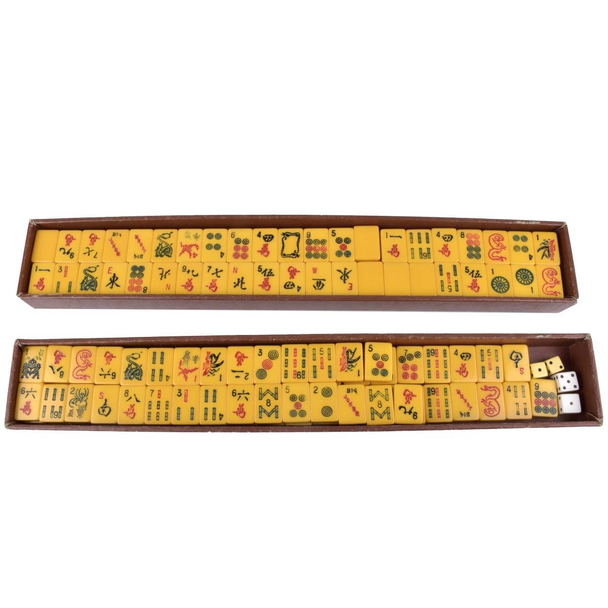 Vintage Chinese Mahjong Set in Fitted Case. Includes: Five rails, pair of dice together with a pair of small dice, and 152 tiles. Box measures 3-1/4" x 19-1/2" x 9". Condition: Box has some wear, good condition Estimate: $50.00 - $100.00 Domestic Shipping: $72.00