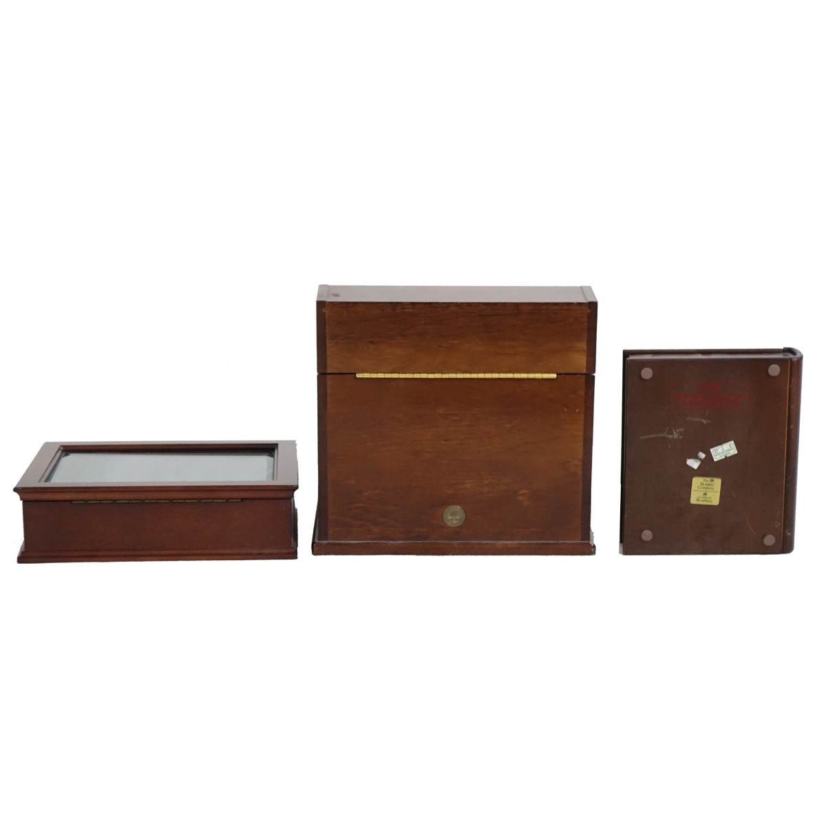 Three Vintage Wood Pen Display Boxes. Two with glass, one with brass accents. Two signed The Bombay Company. Largest measures 9-3/8" H, 10-1/8" W, 7-7/8" D. Condition: Good vintage pre-owned used condition. Surface wear from normal use. Estimate: $50.00 - $100.00 Domestic Shipping: $85.00