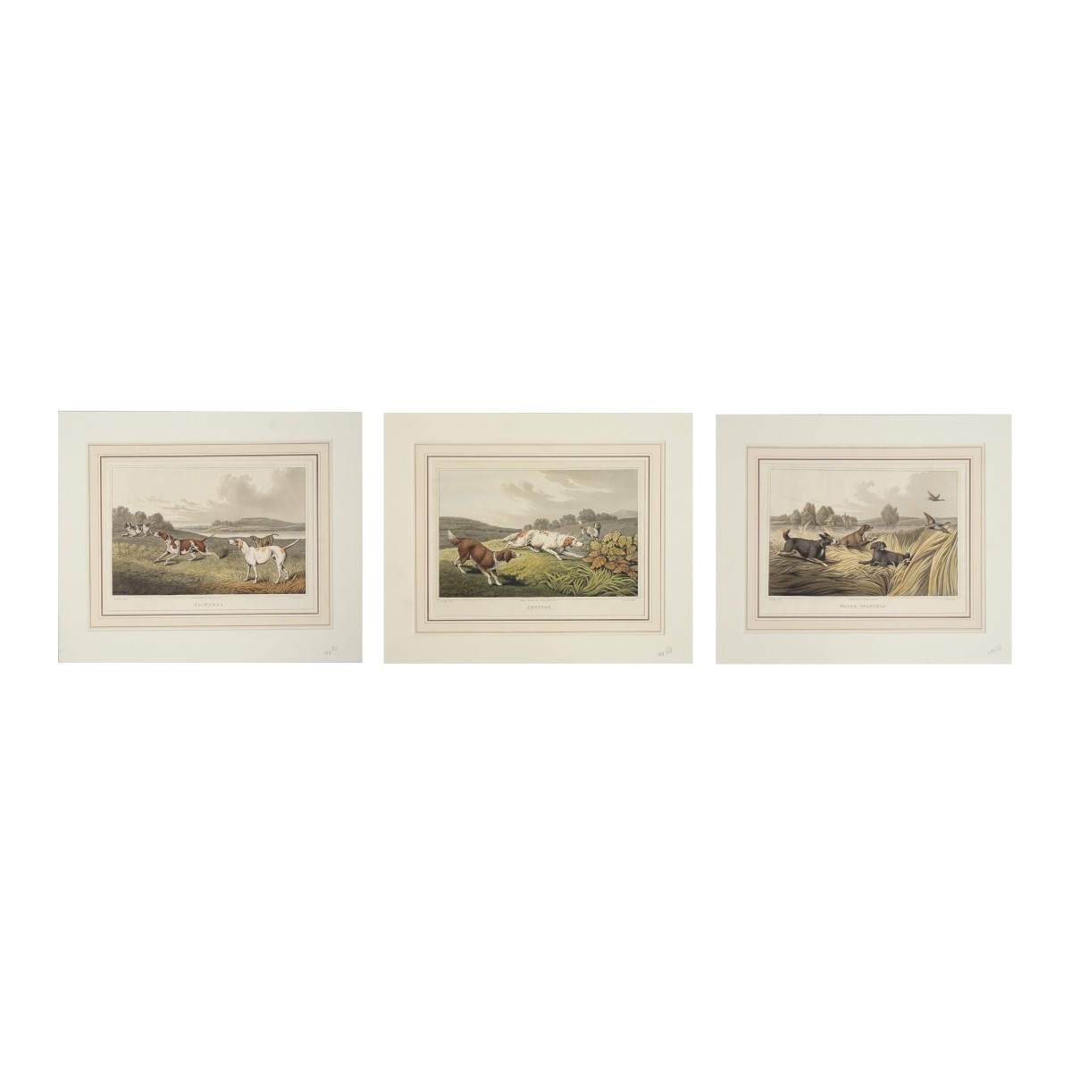 Three (3) Hand Colored Etchings After: Henry Thomas Alken, British (1785 - 1851). I. Clark Sculp. Includes "Water Spaniels", "Pointers", and "Setters". London, Published Thomas M'Lean, Unframed, mounted on matted surface. Measures 15" H x 18-1/2" W. Condition: Light foxing overall good condition Estimate: $50.00 - $100.00 Domestic Shipping: $78.00