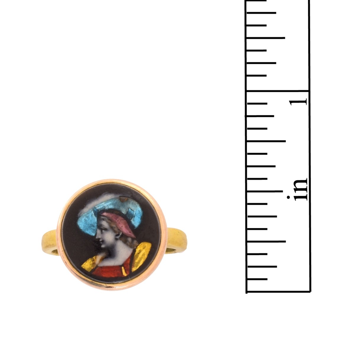 Antique 19th Century French Enamel and 14 Karat Yellow Gold Ring. Unsigned. Ring size 6. Ring top measures 1/2" diam. Approx. weight: 5.5 grams. Condition: Good antique condition. Surface abrasions to enamel consistent with age and normal use. Estimate: $200.00 - $400.00 Domestic Shipping: $28.00