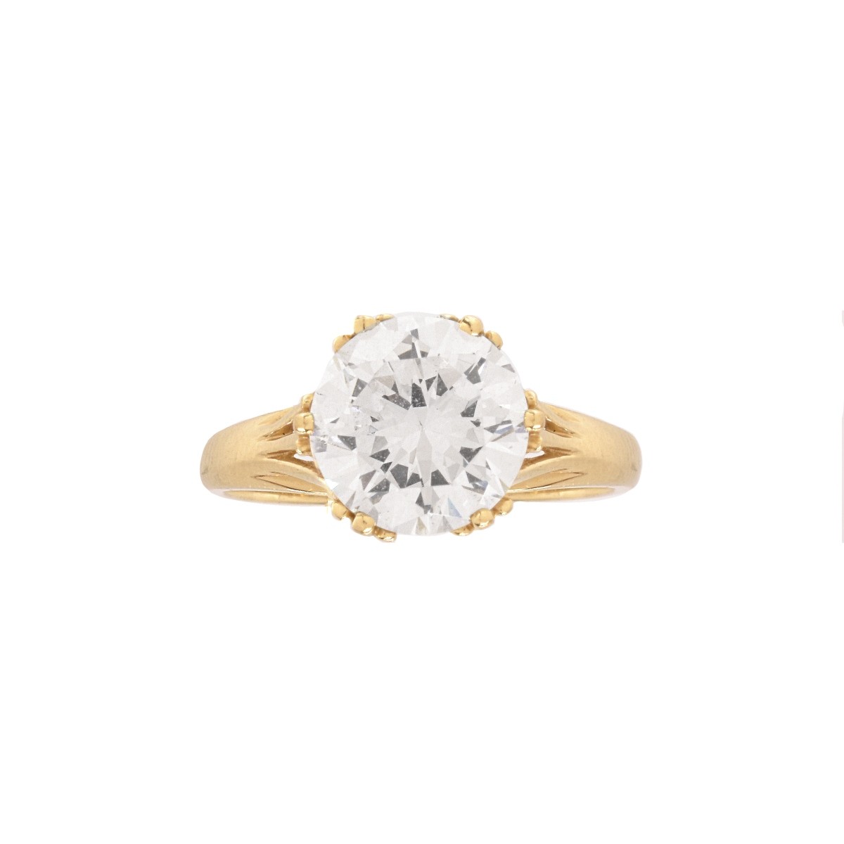 Vintage Approx. 2.25 Carat Round Brilliant Cut Cubic Zirconia and 14 Karat Yellow Gold Engagement Ring. Stamped 14K. Ring size 8. Approx. weight: 3.75. grams. Condition: Very good vintage pre-owned condition. Estimate: $100.00 - $200.00 Domestic Shipping: $28.00