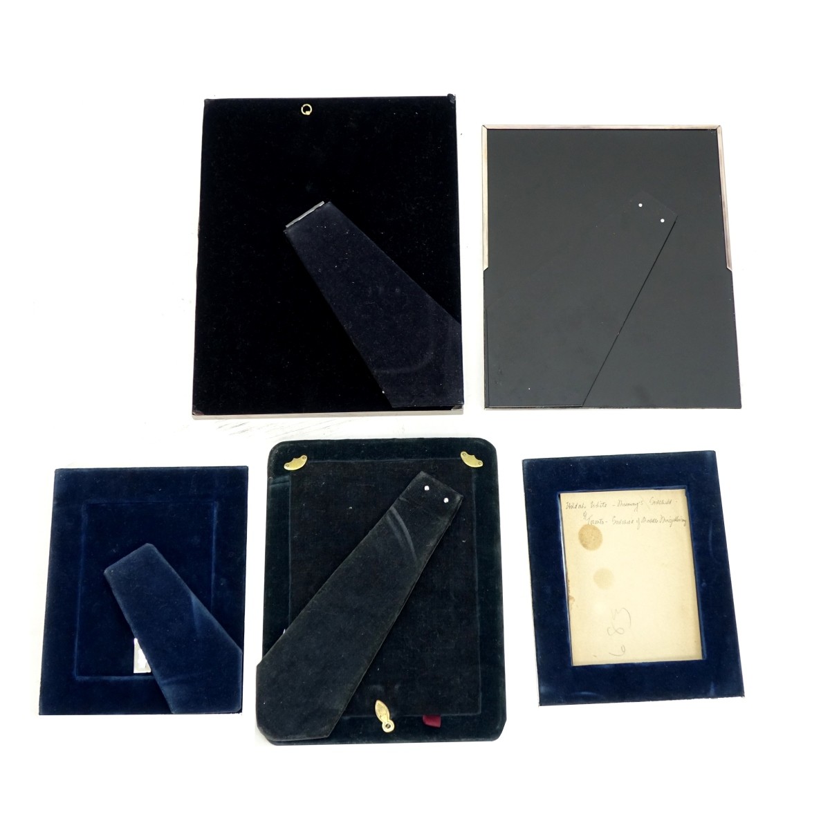 Three (3) Sterling Photo Frames along with Ralph Lauren Silverplate Photo Frames. Makers: Tiffany & Co., Gorham, and a KFLd English with hallmarks. Tiffany and Gorham frame have inscriptions to the surfaces. Largest measures 11-1/4" x 8-1/2", smallest measures 7-1/2" x 6". Provenance: The estate of Leon Amar, Palm Beach, Florida. Condition: One Ralph Lauren frame is missing its backing, normal cleaning necessary on all items. Estimate: $50.00 - $100.00 Domestic Shipping: $76.00