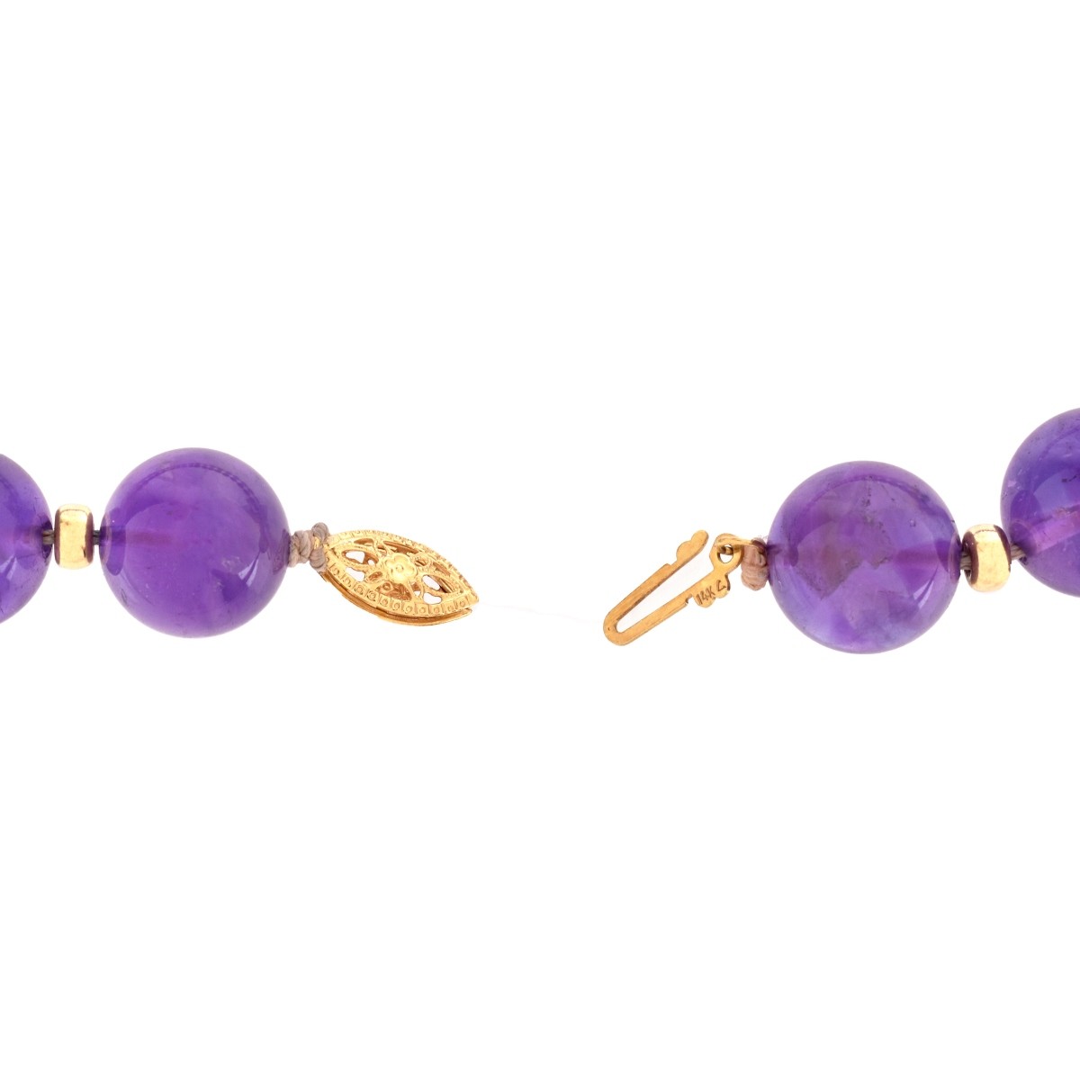 Vintage Amethyst Bead and 14 Karat Yellow Gold Necklace. Clasp stamped 14K. Beads measure 12mm. Approx. weight: 77.36 grams. Condition: Very good vintage condition. Estimate: $100.00 - $300.00 Domestic Shipping: $30.00