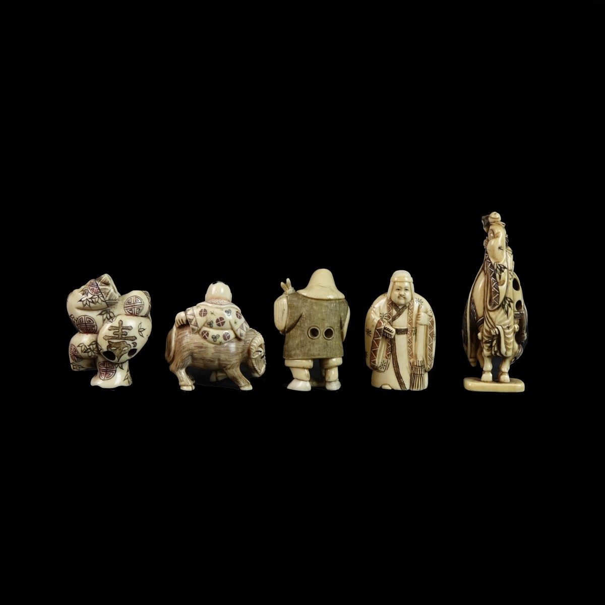 Grouping of Five (5) Antique Japanese Polychrome Carved Netsukes. All signed. Mostly with cord holes. Tallest measures 3-1/4" H, smallest measures 2" H. Condition: Minor rubbing overall good condition Estimate: $50.00 - $150.00 Domestic Shipping: $38.00