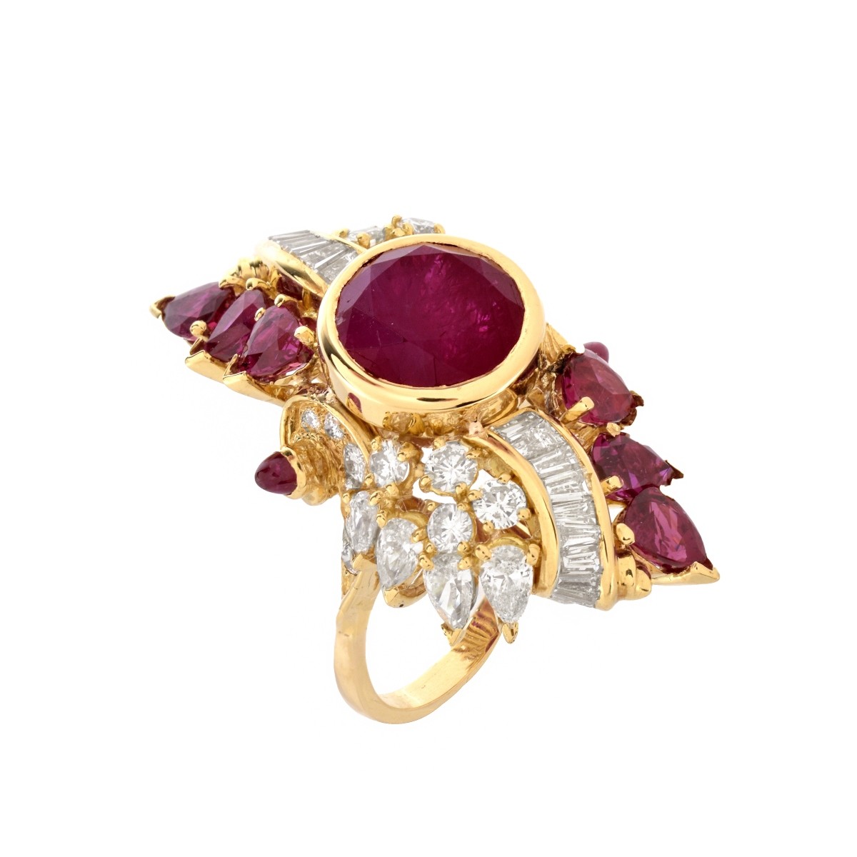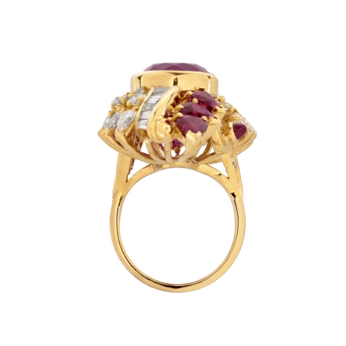 Vintage Approx. 7.19 Carat TW Ruby, 4.0 Carat TW Diamond and 18 Karat Yellow Gold Cluster Ring. Set in the center with a 4.19 carat round cut Burma ruby and accented with 3.0 carat TW pear shape and cabochon rubies. Further accented with 4.0 carat TW forty seven round, pear and tapered baguette diamonds, G-H color, VS1-VS2 clarity. Ring size 6-1/2. Approx. weight: 18.10 grams. Condition: Very good condition. Estimate: $6000.00 - $10,000.00 Domestic Shipping: $30.00