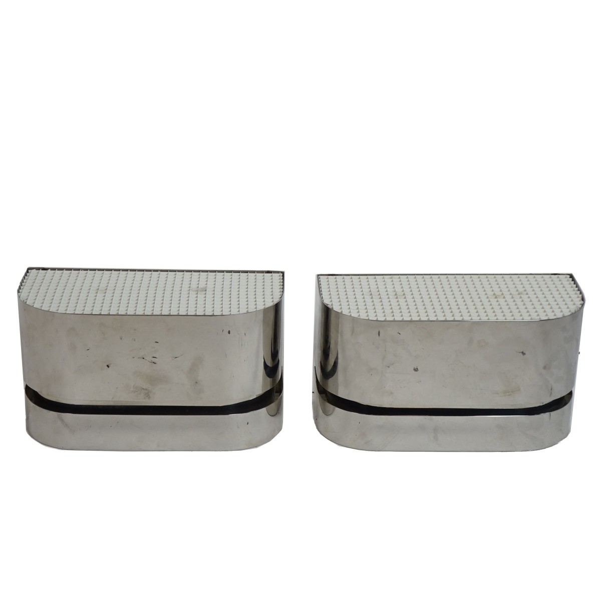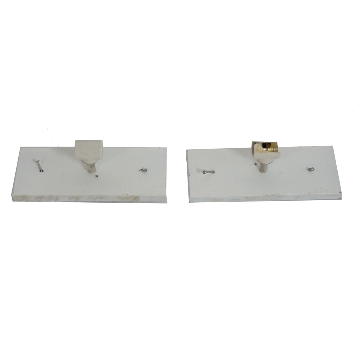 Pair of Mid Century Modern Chrome Wall Sconces. Unsigned. Measures 9" x 16-1/2' x 7". Condition: One interior fixture has a loss to thew covering of the bulb overall good condition Estimate: $300.00 - $600.00 Domestic Shipping: Third party