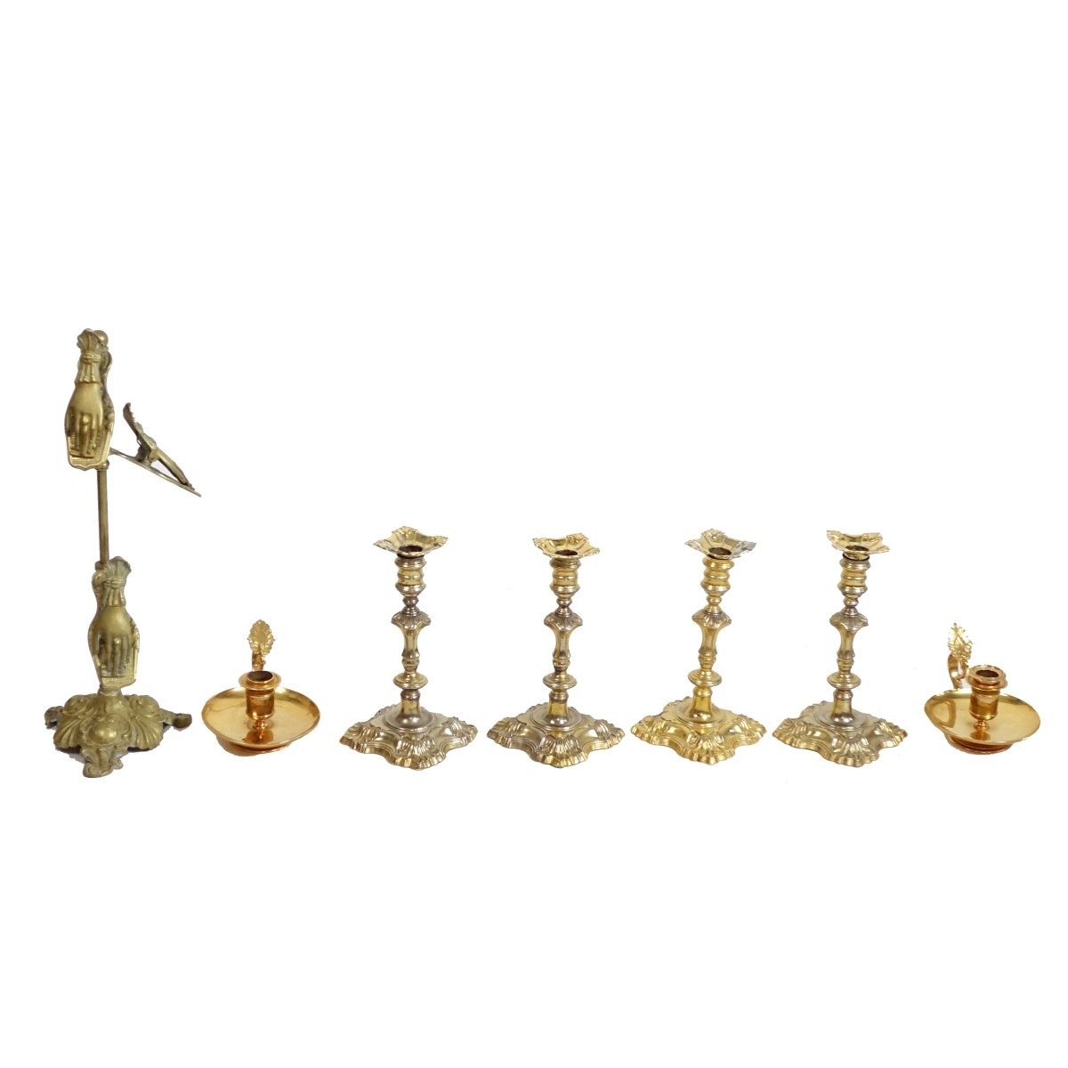 Lot of Seven (7) Vintage Assorted Brass Tableware. Includes set of four candlesticks, pair of chamber sticks, and a art nouveau hands clip stand. Candlesticks measure 8-1/2, stand measures 17-1/4" H. Provenance: The estate of Leon Amar, Palm Beach, Florida. Condition: Candlesticks have rubbing to the surface, stand has normal oxidation, or else good condition. Estimate: $50.00 - $100.00 Domestic Shipping: Third party