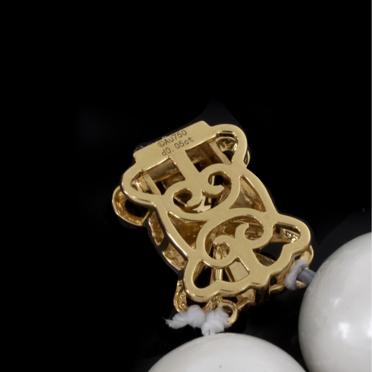 Double Strand Sixty Five 11.0-14.5mm South Sea Pearl Necklace with Diamond and 18 Karat Yellow Gold Clasp. Pearls with good polish and luster, minor natural blemishes. Stamped 750. Measures 16-1/2" L. Approx. weight: 197.9 grams. Condition: Very good condition. Estimate: $5000.00 - $7000.00 Domestic Shipping: $32.00