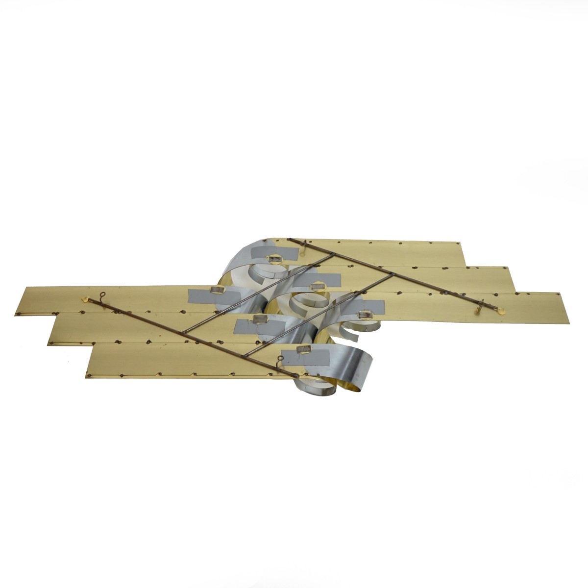 Curtis Jere, American (1910 - 2008) Two-Toned Metal Wall Hanging Sculpture "Abstract Composition" Signed and Dated 1989. Measures 20" x 64". Condition: Good condition. Estimate: $500.00 - $1500.00 Domestic Shipping: Third party
