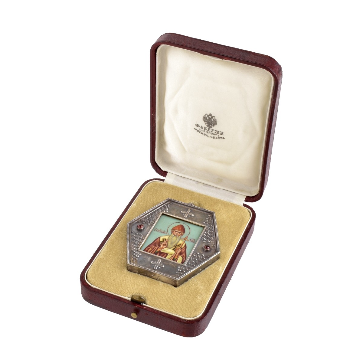 Russian Faberge Silver and Painted Wood Travel Pendant Icon Depicting Saint Spyridon. Accented with cabochon garnets. With fitted box stamped Faberge. Icon signed Faberge and stamped with 91 zolotnik mark. Measures 3" H, 2-5/8" W; box measures 4-3/4" x 3-3/8". Approx. weight (icon): 65.81 grams. Condition: Good condition. Wear to box. Estimate: $1000.00 - $2000.00 Domestic Shipping: $30.00
