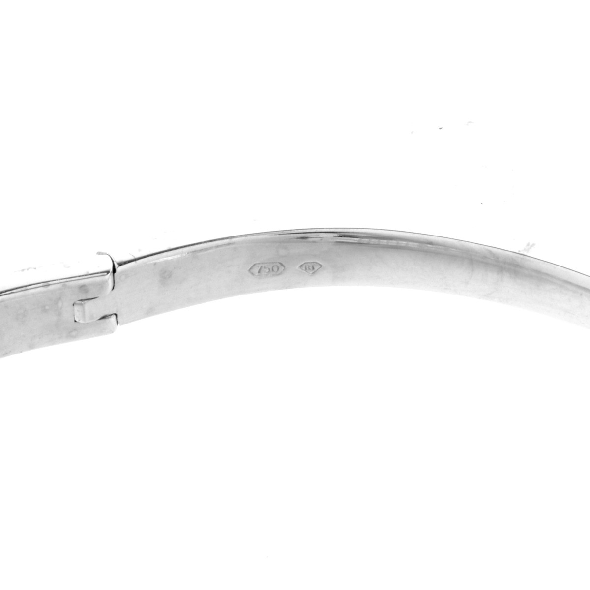 Approx. 3.50 Carat One Hundred Sixty One Round Brilliant Cut Diamond and 18 Karat White Gold Hinged Bangle Bracelet. Diamonds F-G color, VS clarity. Stamped 750. Measures 6-1/2" L, 3/16" W. Approx. weight: 19.18 grams. Condition: Very good condition. Estimate: $2500.00 - $3500.00 Domestic Shipping: $30.00