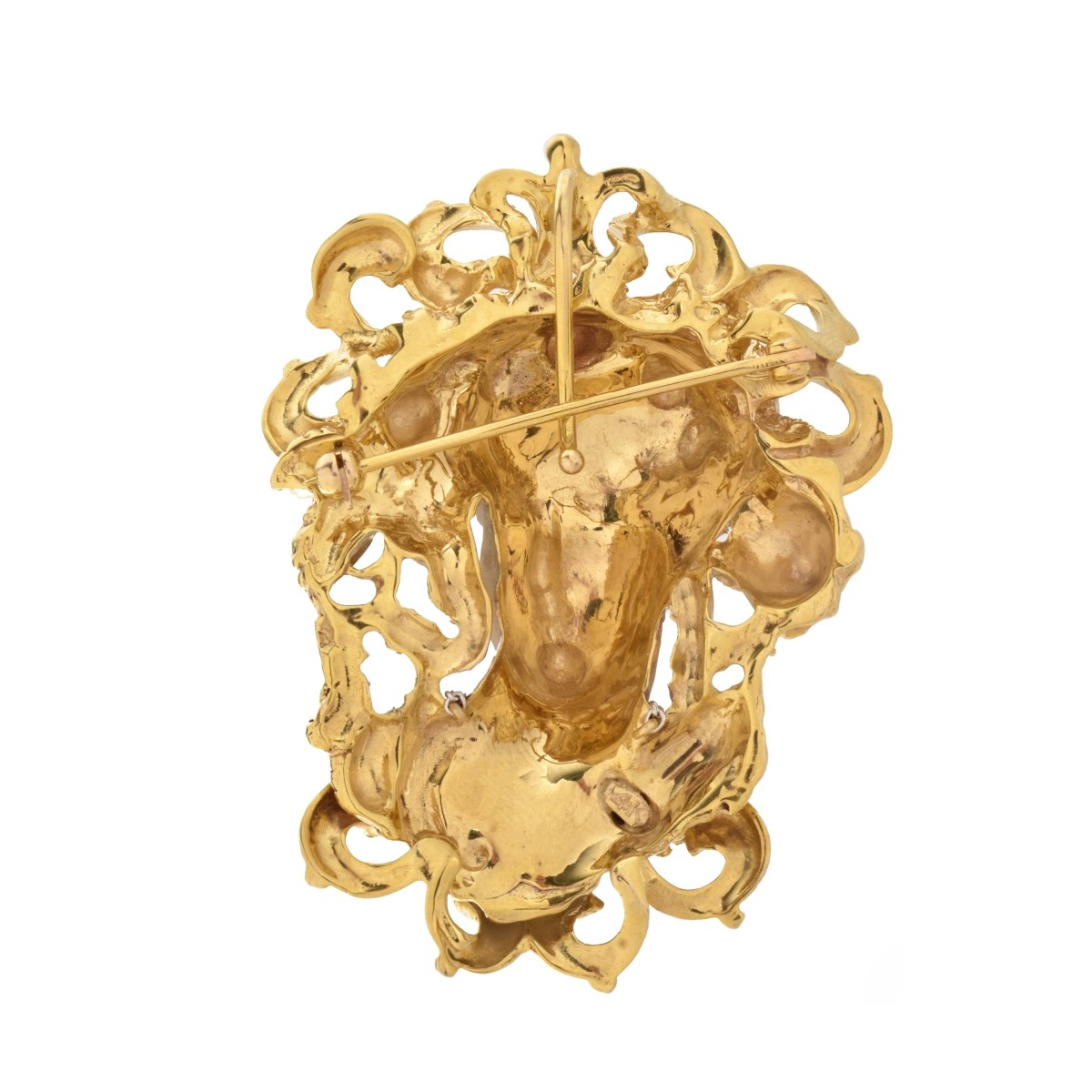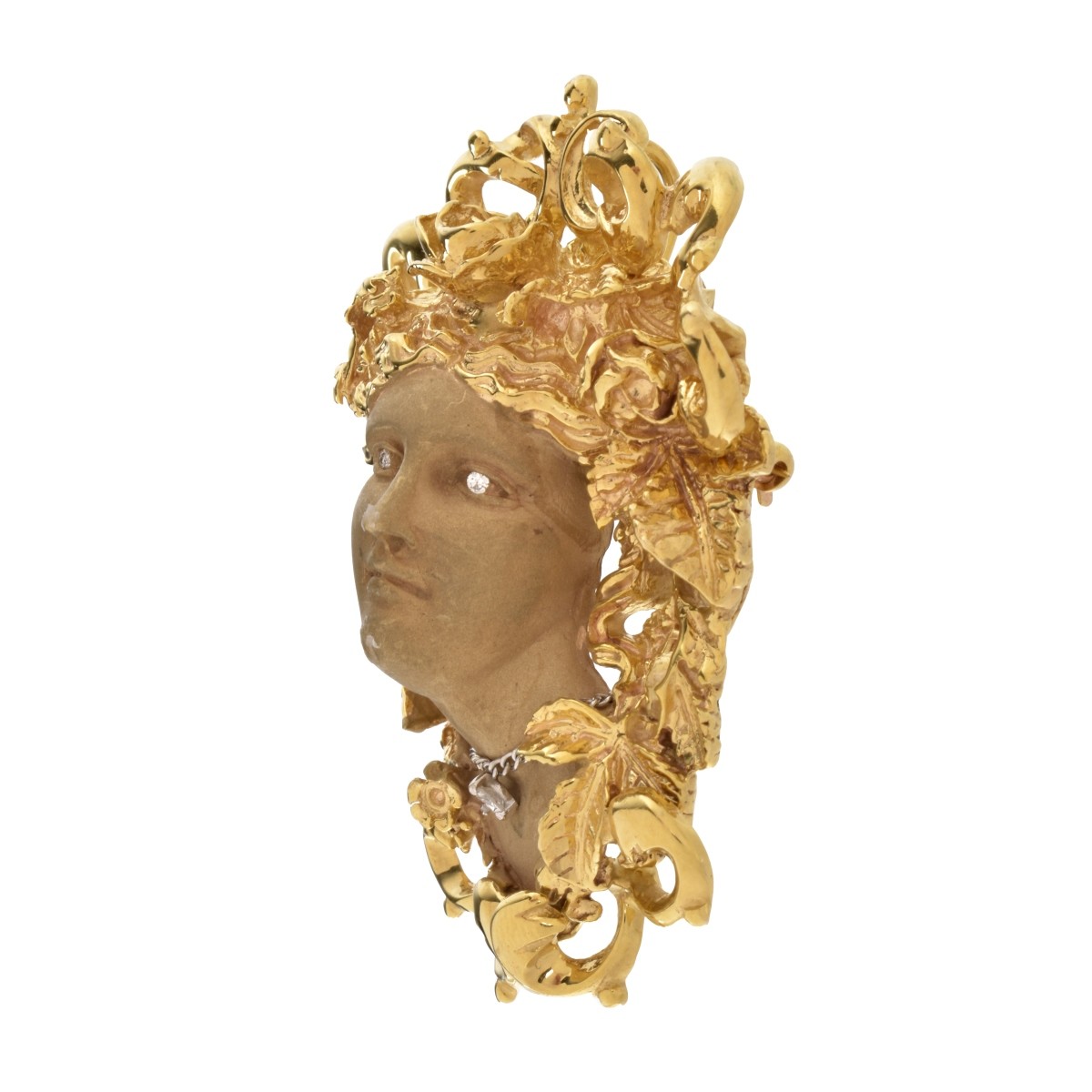 Vintage Large Heavy 14 Karat Yellow Relief Cameo Pendant / Brooch with Three Round Brilliant Cut Diamond Accents. Stamped 14K. Measures 2-3/8" H, 1-5/8" W. Approx. weight: 46.14 grams. Condition: Very good condition. Estimate: $1800.00 - $2500.00 Domestic Shipping: $30.00