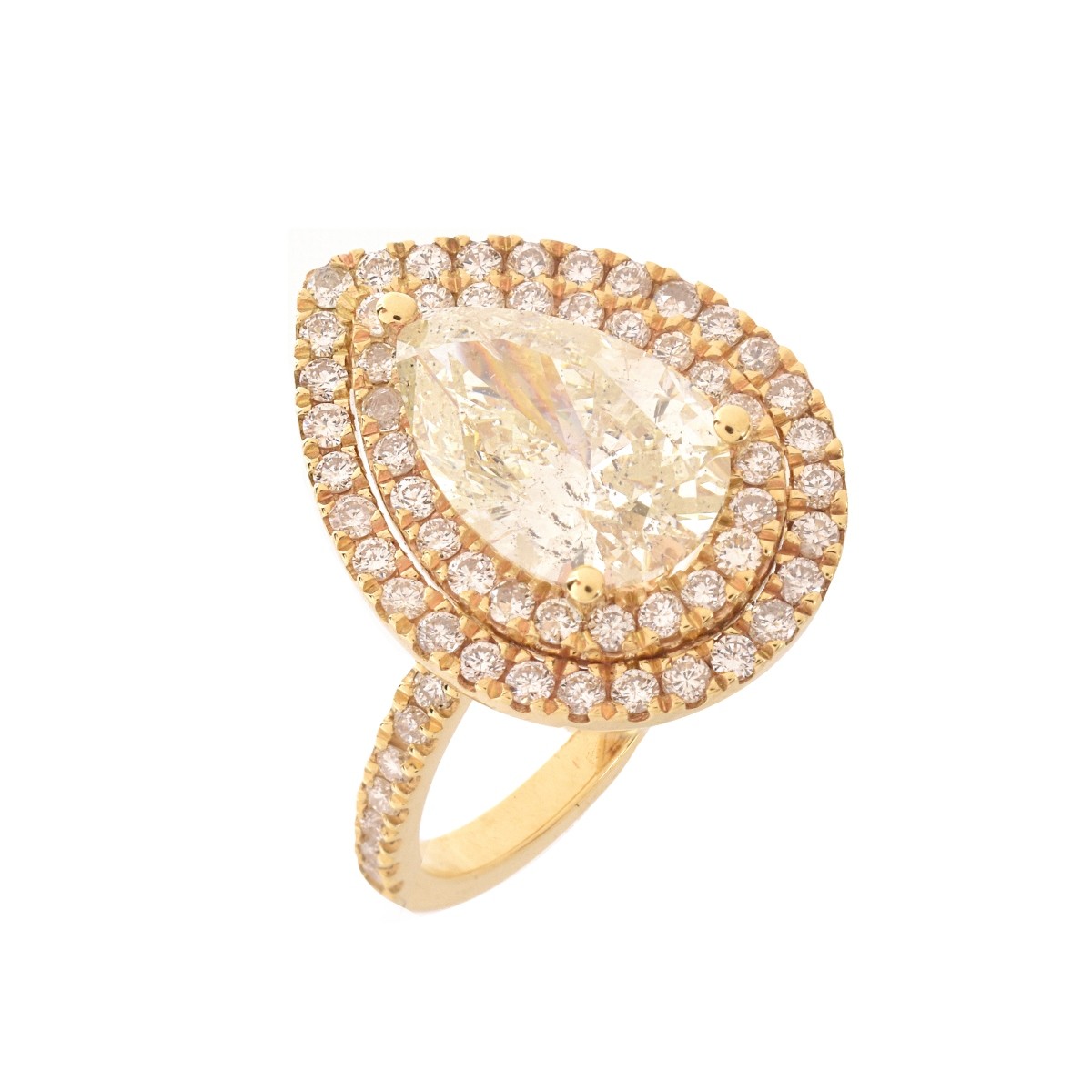 AIG Milan Certified 2.78 Carat TW Diamond and 14 Karat Yellow Gold Engagement Ring. Set in the center with a 2.07 carat pear shape diamond, I color, SI3 clarity. Accented throughout with .71 carat TW seventy round brilliant cut diamonds, D-E color, VS1-VS2 clarity. Ring size 6-1/2. Approx. weight: 4.47 grams. AIG Milan report J30100748629 dated 7/19/2020 to accompany this Lot. Condition: Very good condition. Estimate: $7000.00 - $10,000.00 Domestic Shipping: $30.00