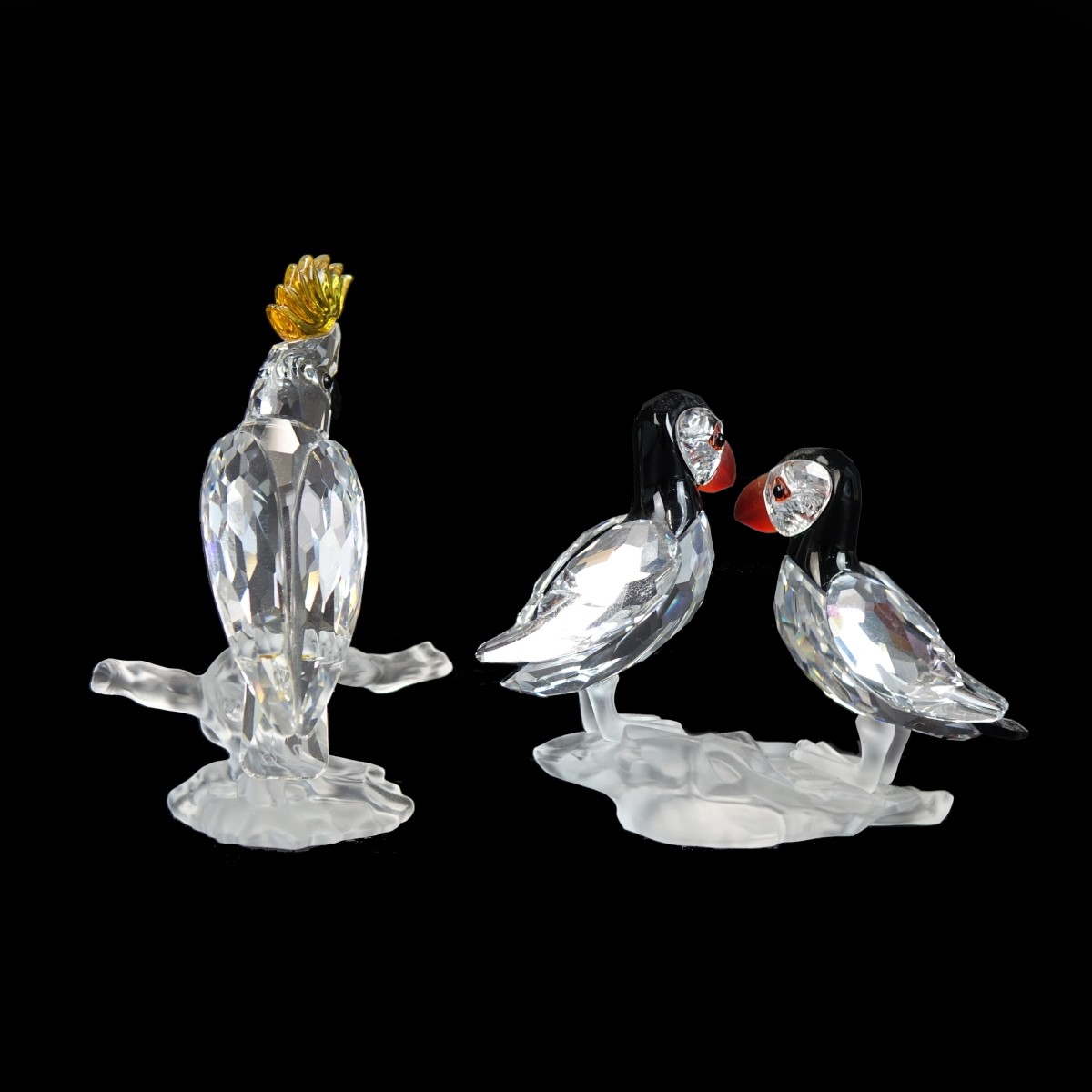 Swarovski Crystal Cockatoo Figurine along Swarovski Crystal Puffins Group. Signed. Cockatoo measures 3-1/4", puffins measures 2-3/8' x 3-1/4'. Condition: Good condition. Estimate: $50.00 - $200.00 Domestic Shipping: $32.00