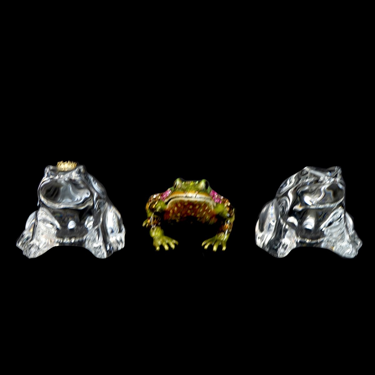Jay Strongwater Enamel Bronze and Swarovski Crystal Frog Paperweight Clock along with a Pair of Baccarat Crystal Frogs. All signed. Jay Strongwater frog measures 2-1/4" x 3", others measure 3" x 3-1/8". Condition: Good condition. Clock needs batteries. The gallery does not warranty the running condition of clocks. Estimate: $100.00 - $200.00 Domestic Shipping: $48.00