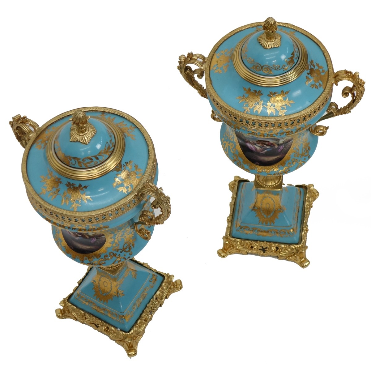 Pair of 20th Century Limoges Sevres Style Blue Celeste Porcelain Urns. Signed on the bottom side. Courting scene on front and obverse sides, gilt embellishments, and gilt metal mounts. Measures 20-3/4" x 10-1/2". Condition: Good condition. Estimate: $200.00 - $600.00 Domestic Shipping: Third party
