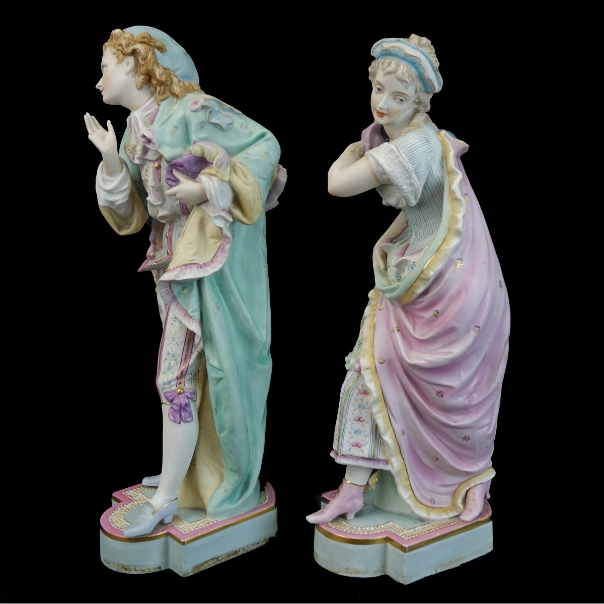 Pair of Meissen Style Hand Painted Bisque Porcelain Figures. Marked on the bottom side. Measures 18-3/4" Condition: Losses and repairs. This lot has been inspected but may contain further condition issues not listed, sold in As Is condition. Estimate: $50.00 - $150.00 Domestic Shipping: Third party