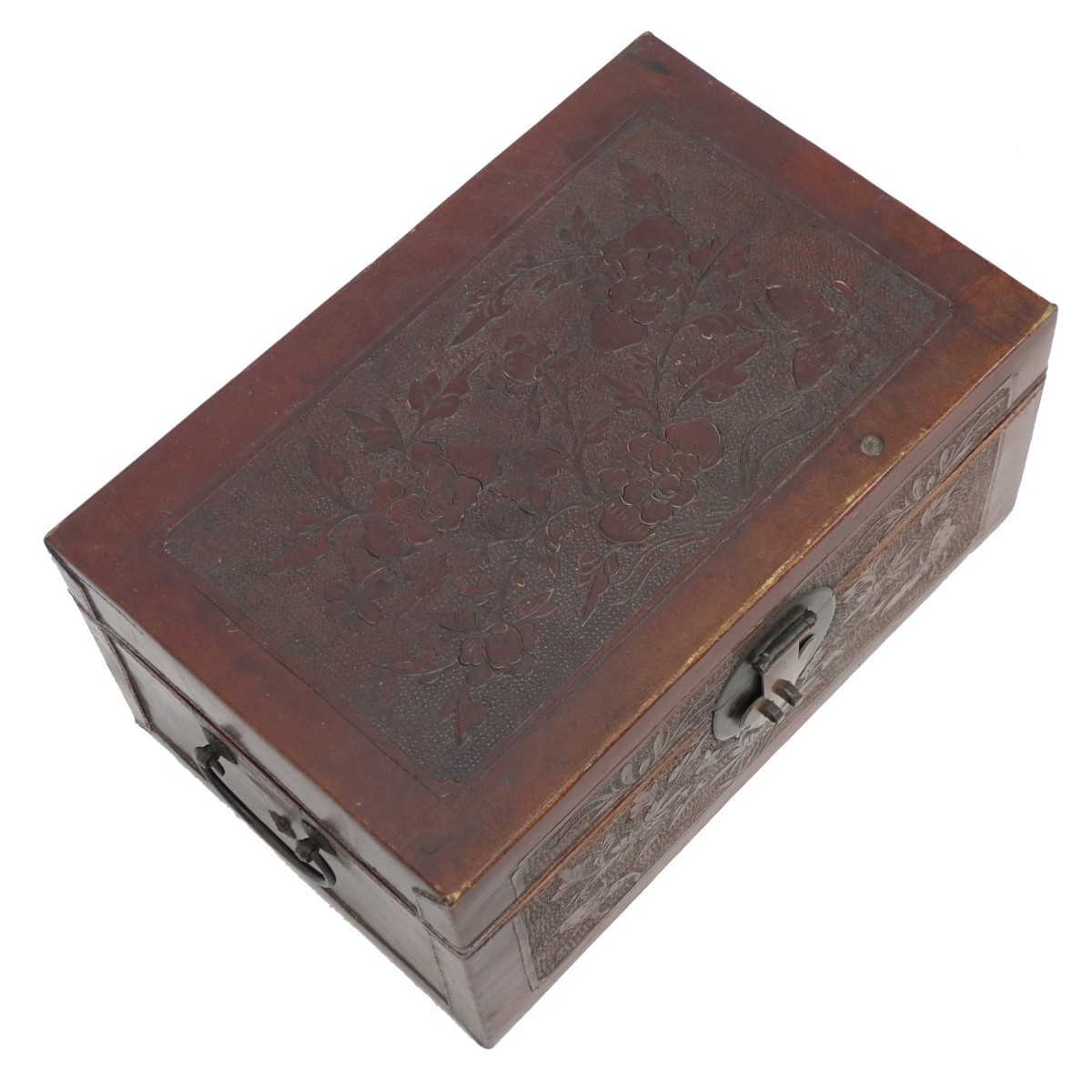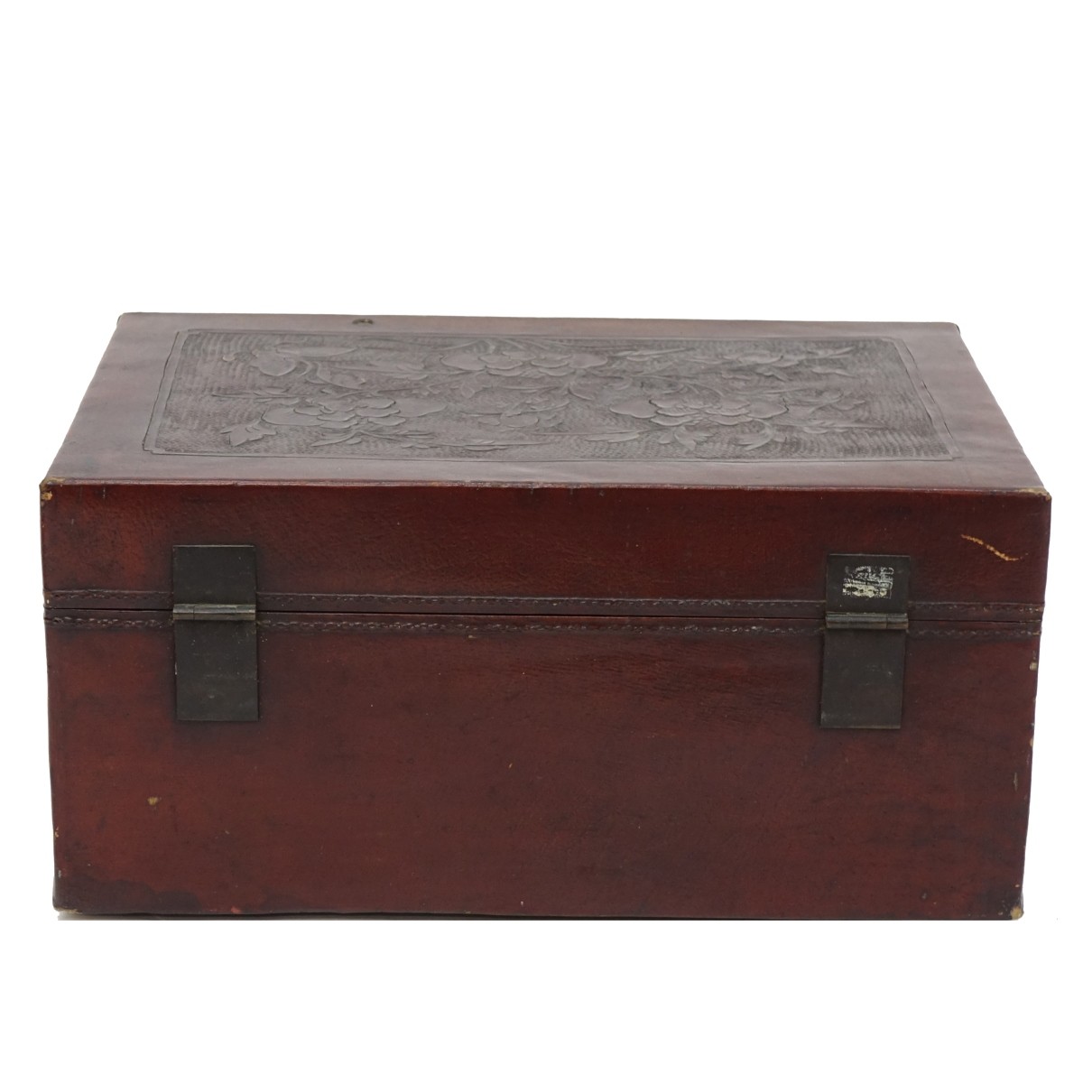 Early 20th Century Chinese Tooled Leather Trunk. Possibly signed to interior case top. Measures 8-3/4" H, 17-1/2" W, 11-3/8" D. Provenance: The estate of Leon Amar, Palm Beach, Florida. Condition: Good condition. Normal surface wear and scratches. Small hole to leather on top. Plastic feet added to underside. Estimate: $100.00 - $300.00 Domestic Shipping: Third party