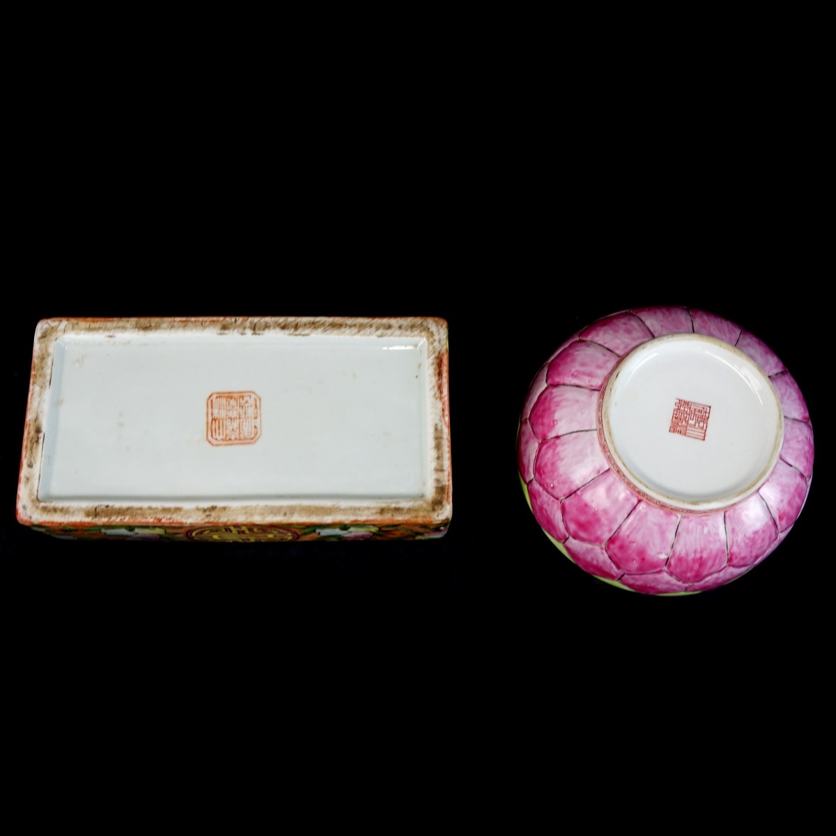 Chinese Porcelain Lotus Covered Bowl together with a Chinese Porcelain Covered Box on Wooden Base. Stamped. Box measures 3-3/4" x 8-1/4", bowl measures 5-3/4" x 6-3/4". Condition: Good condition. Estimate: $100.00 - $300.00 Domestic Shipping: $88.00