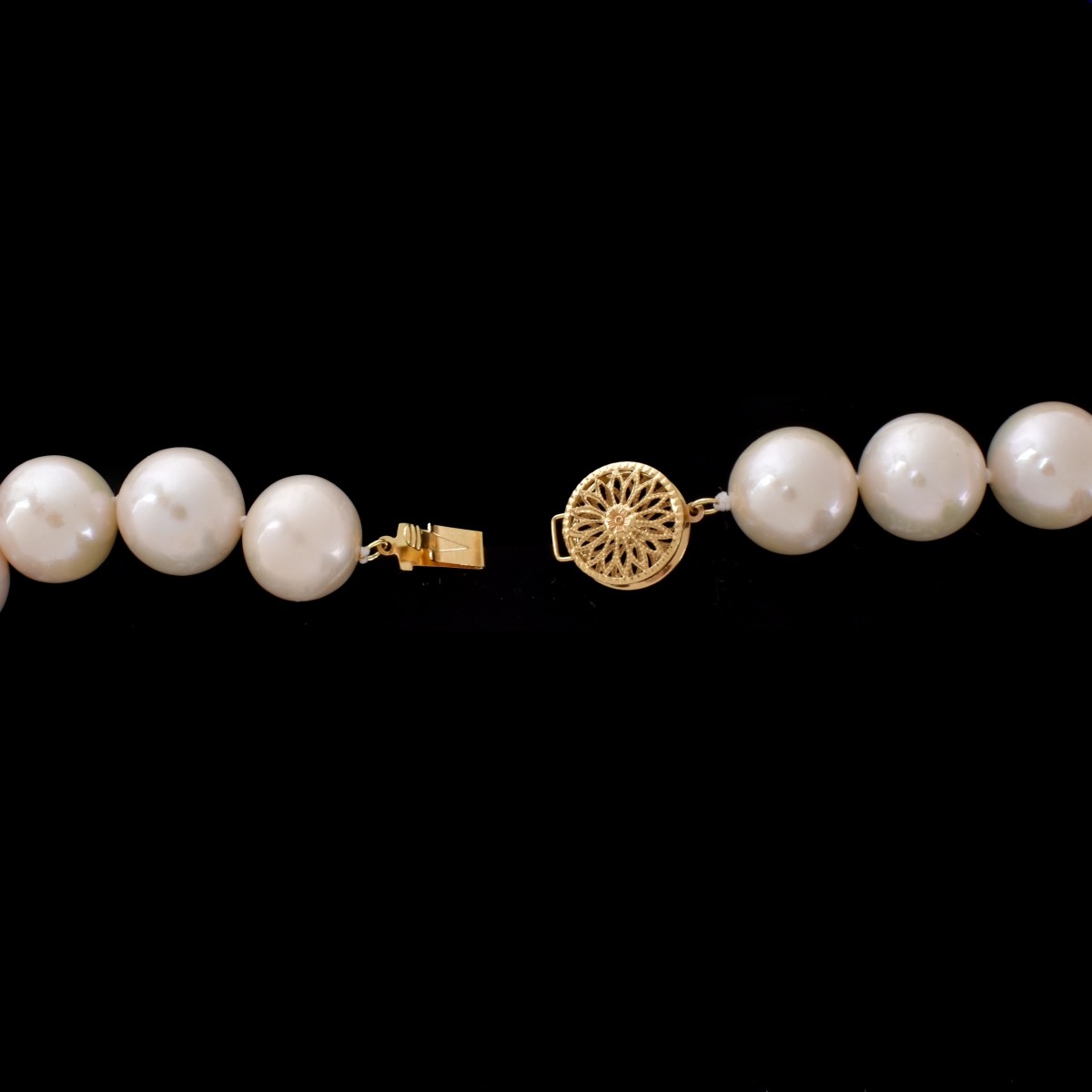 45" Long Single Strand Eighty Nine 12.0-13.0mm South Sea Pearl Necklace with 18 Karat Yellow Gold Clasp. Pearls with pinkish overtones, good luster and polish, minor natural blemishes. Clasp stamped 750. Approx. weight: 258.31 grams. Condition: Very good condition. Estimate: $4000.00 - $6000.00 Domestic Shipping: $32.00