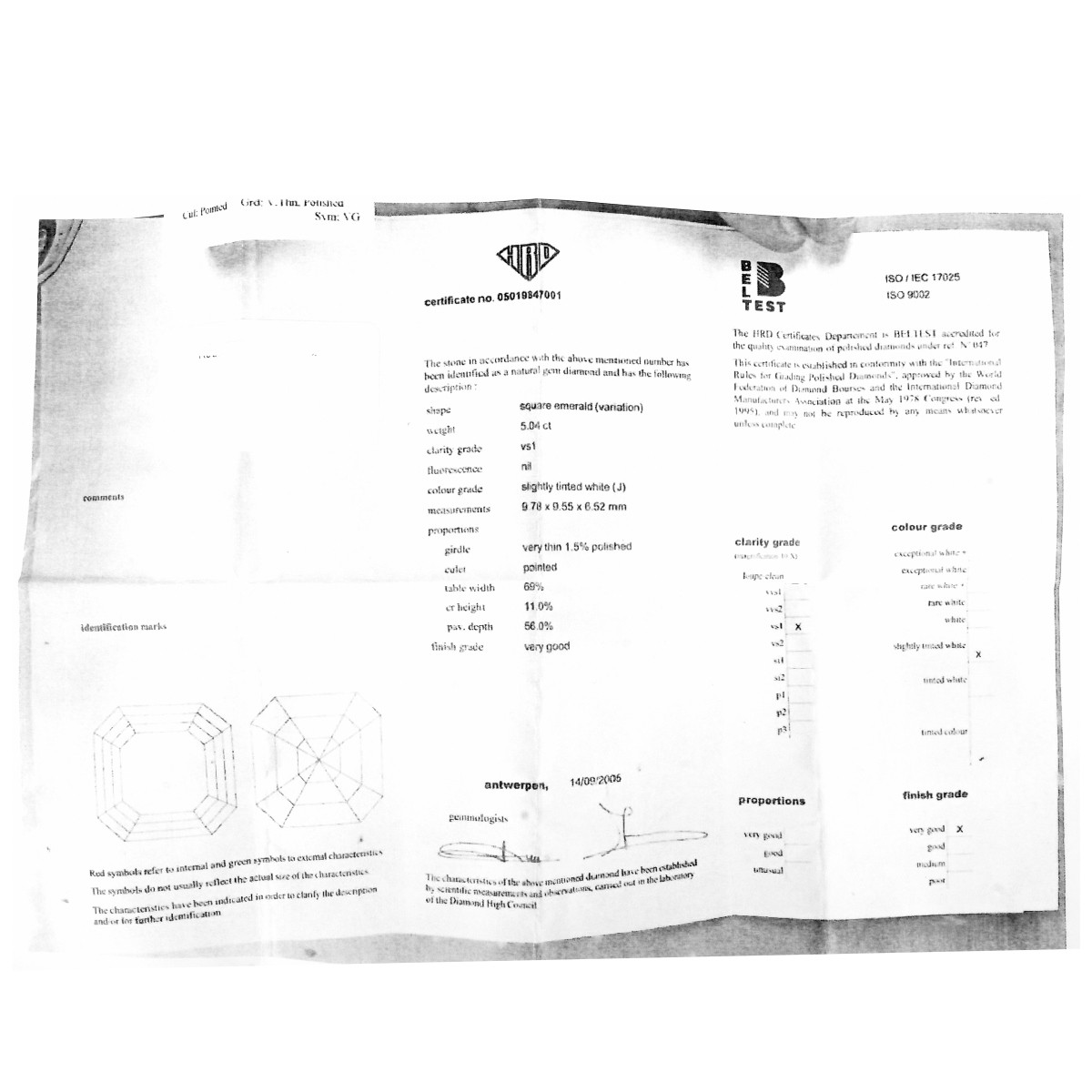 HRD, Antwerp Certified 5.04 Carat Asscher Cut Diamond and Platinum Engagement Ring. Flanked by two asscher cut diamonds totally 2.47 carats. Center diamond J color, VS1 clarity. Flanking diamonds J color, VS1 clarity. Stamped Platinum. Ring size 5-1/4. Approx. weight: 8.60 grams. HRD certificate 05019847001 dated 9/14/2005 to accompany this lot. Condition: Very good condition. Estimate: $50,000.00 - $70,000.00 Domestic Shipping: $30.00