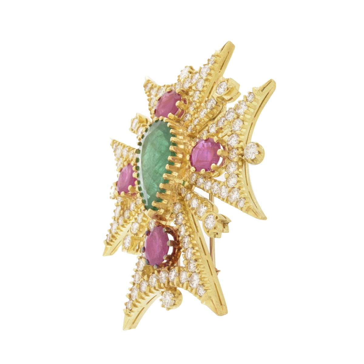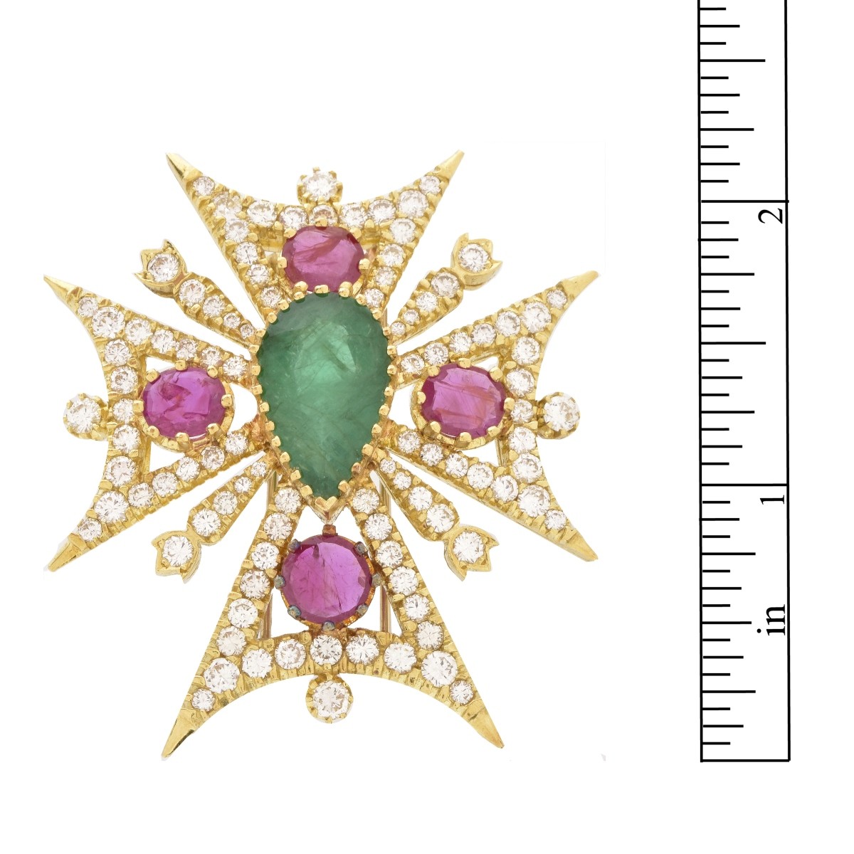 Approx. 9.0 Carat Pear Shape Colombian Emerald, 7.50 Carat TW Four Oval Cut Ruby, 9.50 Carat TW One Hundred Two Round Brilliant Cut Diamond and 18 Karat Yellow Gold Maltese Cross Brooch. Color stones with vivid color. Diamonds E-F color, VVS-VS clarity. Stamped 18K. Measures 2-1/4" H, 2" W. Approx. weight: 45.13 grams. Condition: Very good condition. Estimate: $10,000.00 - $15,000.00 Domestic Shipping: $30.00