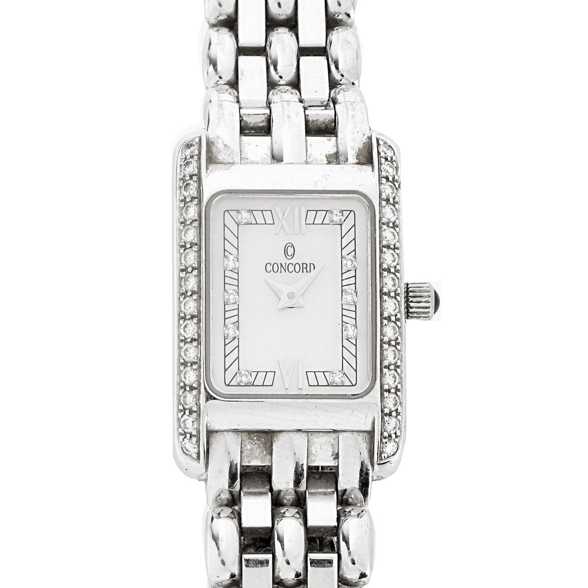 Lady's Concord 18 Karat White Gold and Diamond Bracelet Watch. Swiss quartz movement. Case measures 25.5mm x 17.0mm. Case stamped 18K. Bracelet measures 6" L. Approx. weight: 52.08 grams. Condition: Good condition. Minor surface wear from normal use. Needs cleaning. Likely needs a battery. Please note the gallery does not warranty the running condition of watches. Estimate: $1500.00 - $2500.00 Domestic Shipping: $30.00