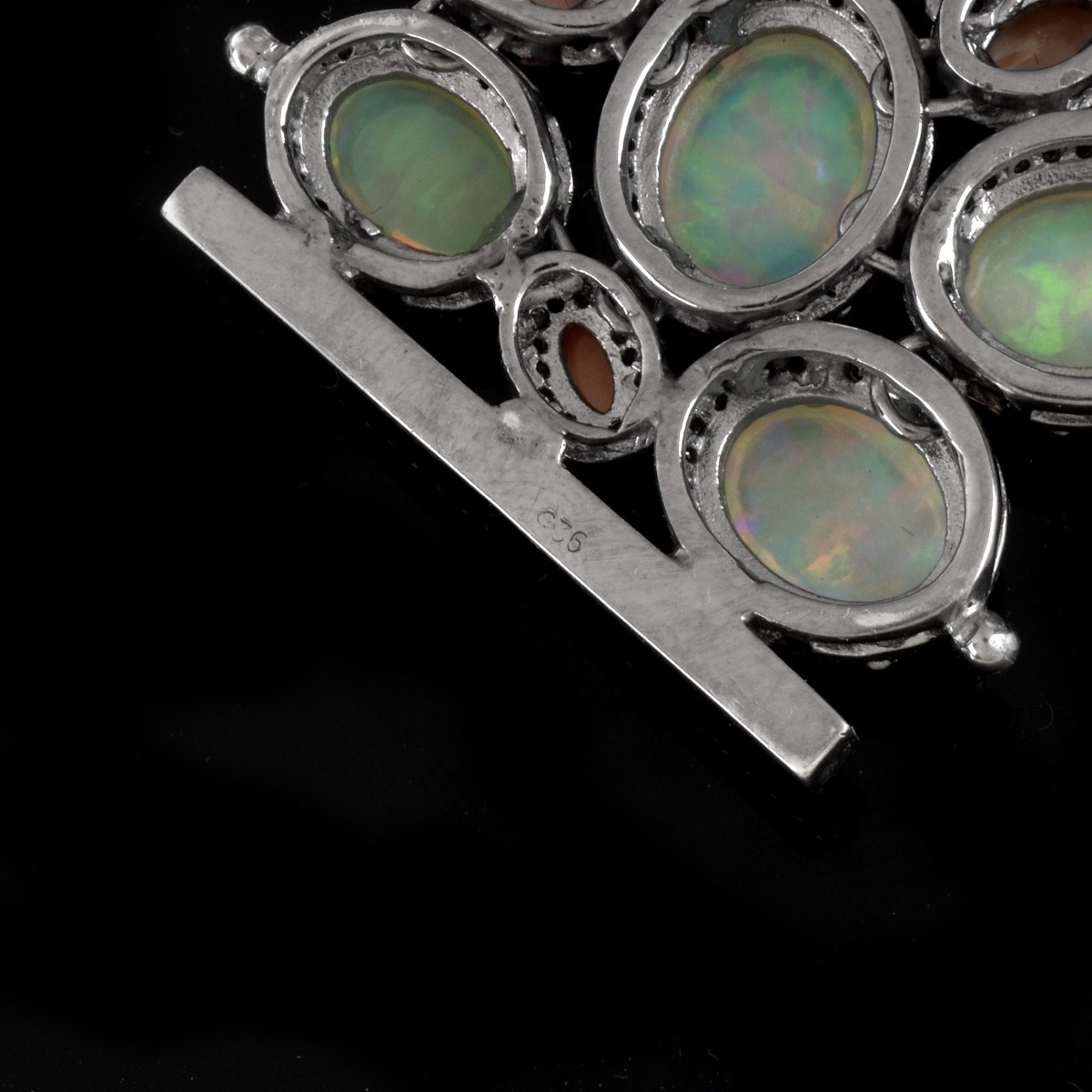 Approx. 175.0 Carat TW Opal and Angel Skin Coral, 4.50 Carat TW Single Cut Diamond and Silver White Bracelet. Opals with good play of multi colors. Diamonds H-I color, VS2-SI1 clarity. Measures 7-3/4" L, 1-1/8" W. Approx. weight:; 82.0 grams. Condition: Very good condition. Estimate: $2000.00 - $3000.00 Domestic Shipping: $32.00