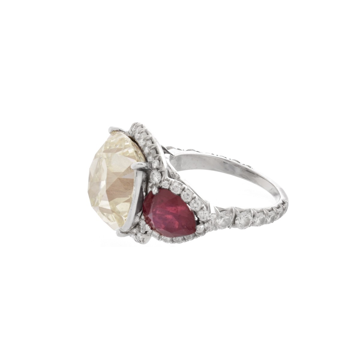 Approx. 13.05 Carat Antique Cushion Cut Diamond, Two Pear Shape Ruby and and Platinum Ring. Accented with round brilliant cut diamonds. Center diamond K-L color, VVS clarity. Rubies with vivid saturation of color. Ring size 6. Approx. weight: 10.74 grams. Provenance Christie's, New York Magnificent Jewels12/11/2007 Sale 1917 Condition: Very good condition. Light wear from normal use. For additional information please contact Russ Kodner, GIA Graduate Gemologist at 954.650.5030 Estimate: $125,000.00 - $175,000.00 Domestic Shipping: $30.00