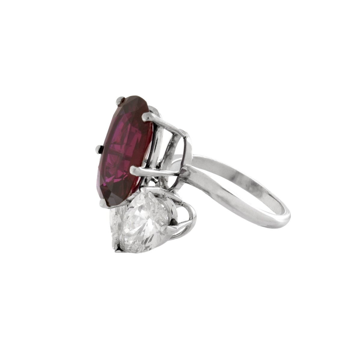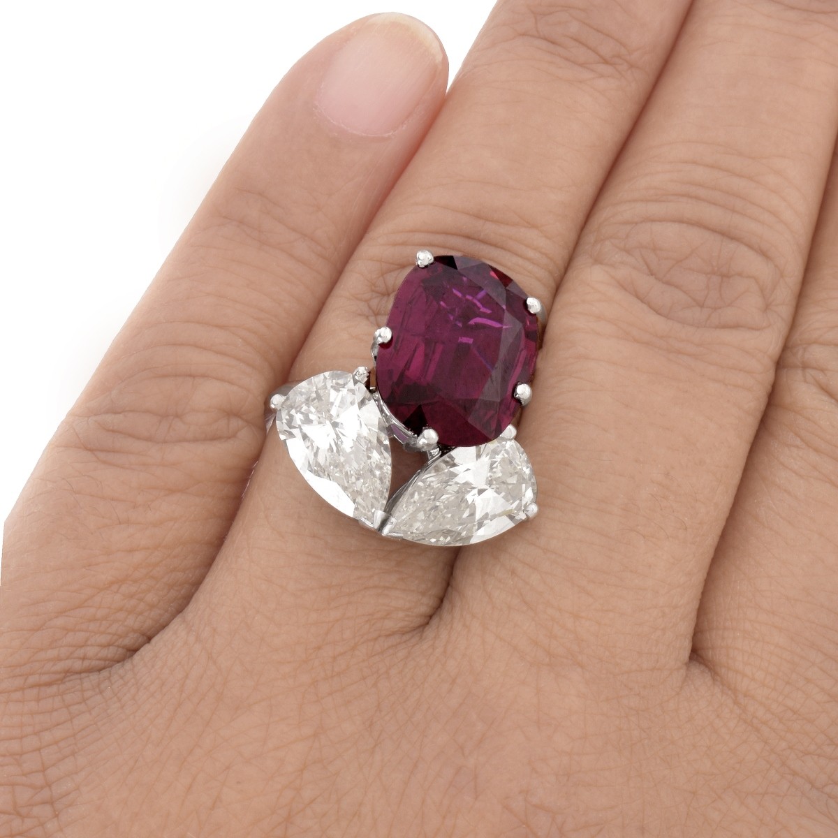 Exceptional Approx. 8.15 Carat Gem Quality Oval Cut Ruby, Approx. 5.0 Carat TW Two Pear Shape Diamond and Platinum Ring. Ruby with vivid saturation of color, measures 15.50 x 11.62 x 5.26mm. Diamonds G-H color, VS1 clarity. Ring size 6. Condition: Very good condition. For additional information please contact Russ Kodner, GIA Graduate Gemologist at 954.650.5030 Estimate: $100,000.00 - $125,000.00 Domestic Shipping: $28.00