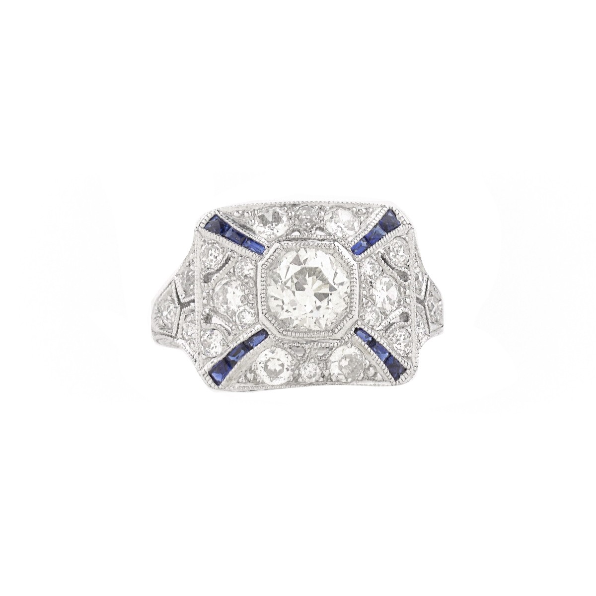 Art Deco style Diamond, Sapphire and Platinum Ring. Set in the center with a .75 carat old European cut diamond, F-G color, VS2 clarity. Accented with .74 carat TW round brilliant cut diamonds, E-F color, VS1-VS2 clarity and .18 carat TW sapphires. Stamped Plat. Ring size 6-1/4. Approx. weight: 5.06 grams. Condition: Very good condition. Estimate: $1000.00 - $5000.00 Domestic Shipping: $28.00