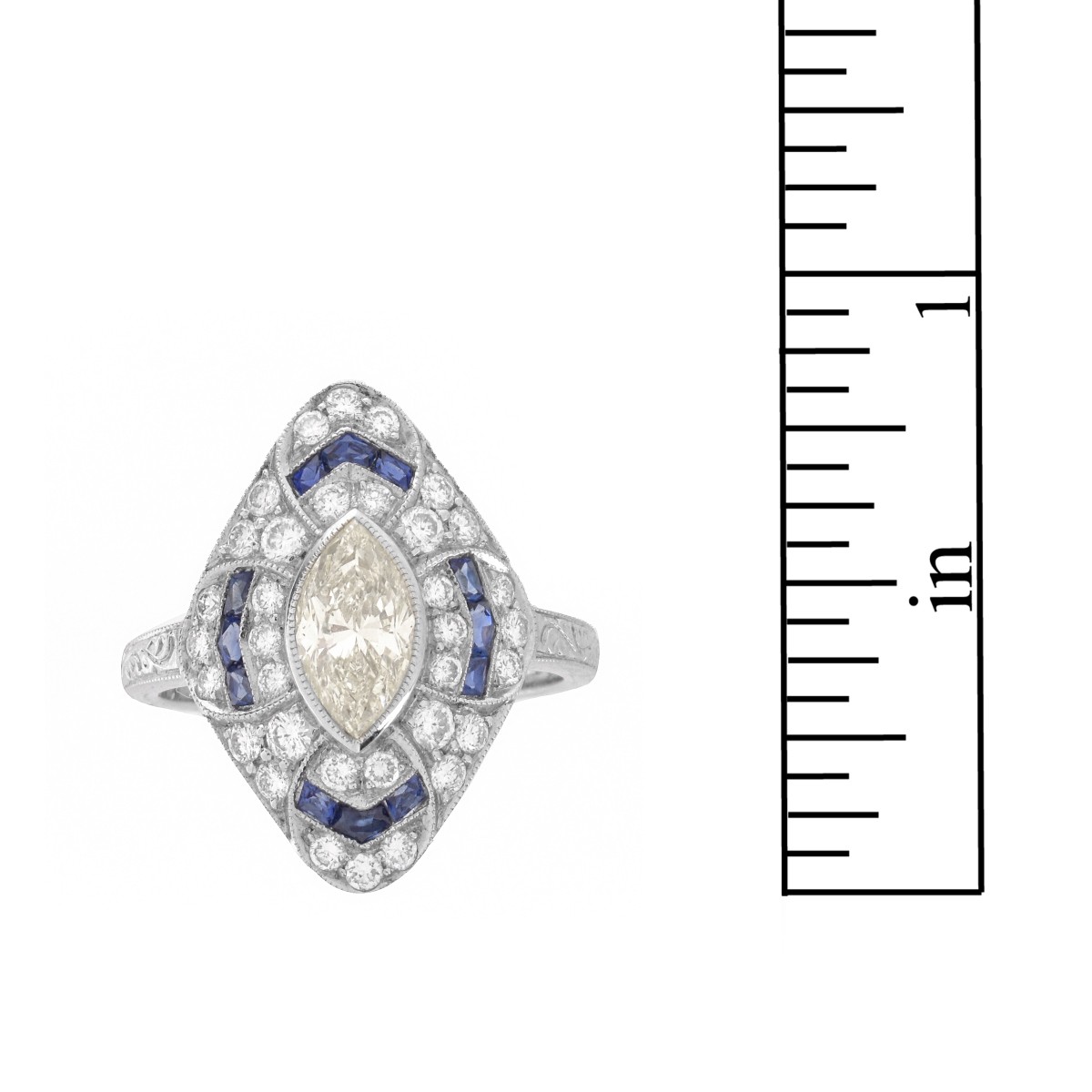 Art Deco style Diamond, Sapphire and Platinum Ring. Set in the center with a 1.02 carat marquise cut diamond, J color, VS1 clarity. Accented with .59 carat TW round brilliant cut diamonds, E-F color, VS1-VS2 clarity and 1.44 carat TW sapphires. Stamped Plat. Ring size 6-1/4. Approx. weight: 6.94 grams. Condition: Very good condition. Estimate: $1000.00 - $5000.00 Domestic Shipping: $28.00