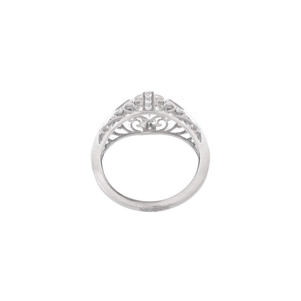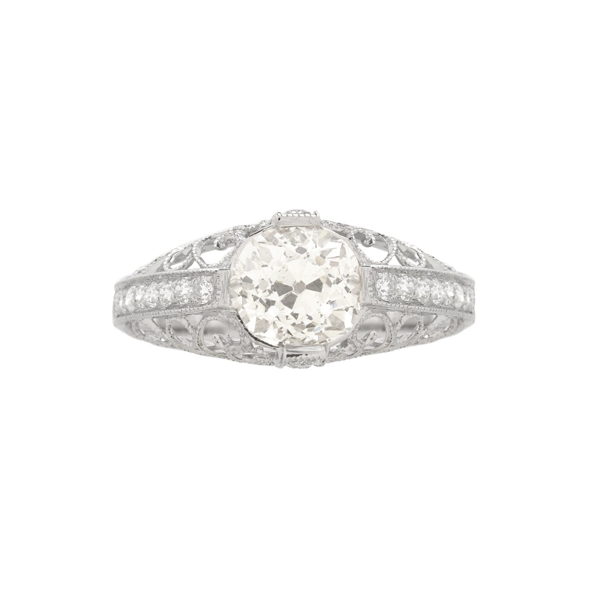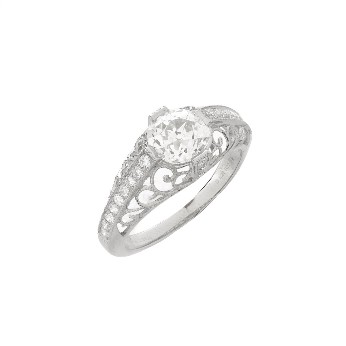 Diamond and Platinum Ring. Set in the center with a 1.22 carat old European cut diamond, G-H color, SI1 clarity. Accented with .27 carat TW round brilliant cut diamonds, E-F color, VS1-VS2 clarity. Stamped Plat. Ring size 6-1/4. Approx. weight: 4.43 grams. Condition: Very good condition. Estimate: $1000.00 - $5000.00 Domestic Shipping: $28.00