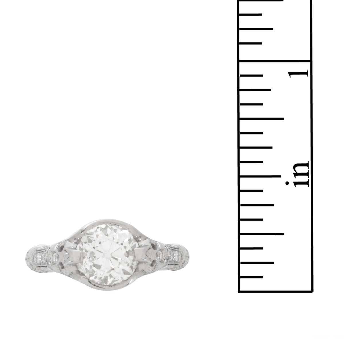 Diamond and Platinum Ring. Set in the center with a 1.16 carat antique oval cut diamond, J color, VS1 clarity. Accented with .20 carat TW round brilliant cut diamonds, E-F color, VS1-VS2 clarity. Stamped Plat. Ring size 6-1/4. Approx. weight: 4.12 grams. Condition: Very good condition. Estimate: $1000.00 - $5000.00 Domestic Shipping: $28.00