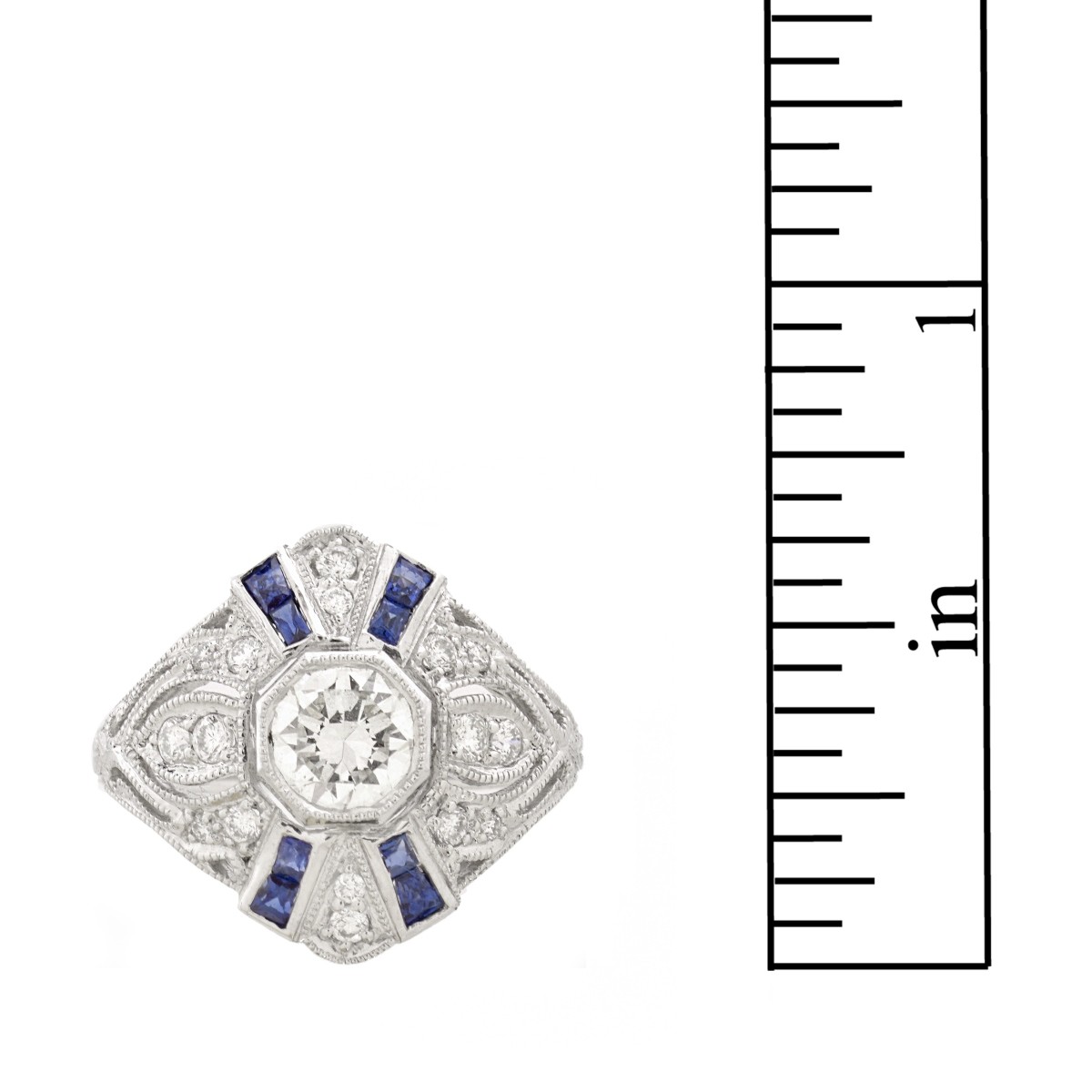 Art Deco style Diamond, Sapphire and Platinum Ring. Set in the center with a .70 carat round brilliant cut diamond, G-H color, VS1 clarity. Accented with .30 carat TW round brilliant cut diamonds, E-F color, VS1-VS2 clarity and .26 carat TW sapphires. Stamped Plat. Ring size 6-1/4. Approx. weight: 5.86 grams. Condition: Very good condition. Estimate: $500.00 - $2500.00 Domestic Shipping: $28.00