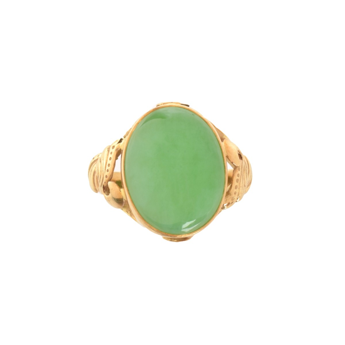 Vintage Chinese Cabochon Green Jade and 18 Karat Yellow Gold Ring. Jade measures 14.5 x 11.0mm. Stamped 18K, signed. Ring size 7-1/2. Approx. weight: 4.09 Condition: Very good vintage condition. Estimate: $200.00 - $400.00 Domestic Shipping: $28.00