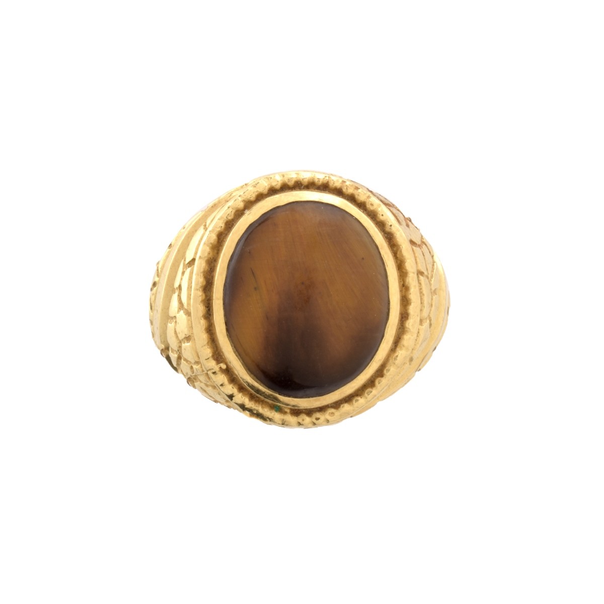 Man's Vintage Tiger Eye and 14 Karat Yellow Gold Ring. Tiger eye measures 1/2" x 7/16". Stamped 14K. Ring size 10. Approx. weight: 9.41 grams. Condition: Good vintage condition. Light surface wear from normal use. Estimate: $300.00 - $400.00 Domestic Shipping: $28.00