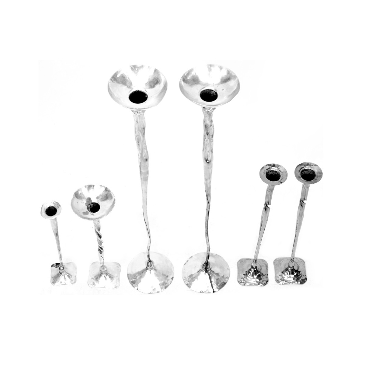 Collection of Six (6) Hessel Studios Metal Candlesticks Consisting of Two (2) Pairs and Two (2) Singles. Signed. Tallest pair measures 26-5/8". Smallest measures 11-1/4". Condition: Some with residue, needs cleaning, rubbing otherwise good condition. Estimate: $100.00 - $300.00 Domestic Shipping: $92.00