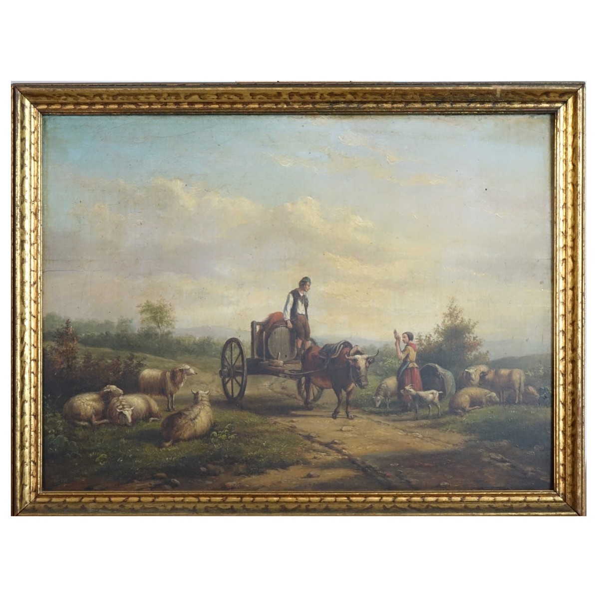 Antique English School Oil on Panel "Cattle Drawn Cart with Farmers" Unsigned. Measures 12-1/2" x 17-1/4', frame measures 14-1/8" x 18-3/4". Condition: Yellowing to panel, needs cleaning, craquelure. Estimate: $50.00 - $100.00 Domestic Shipping: $95.00
