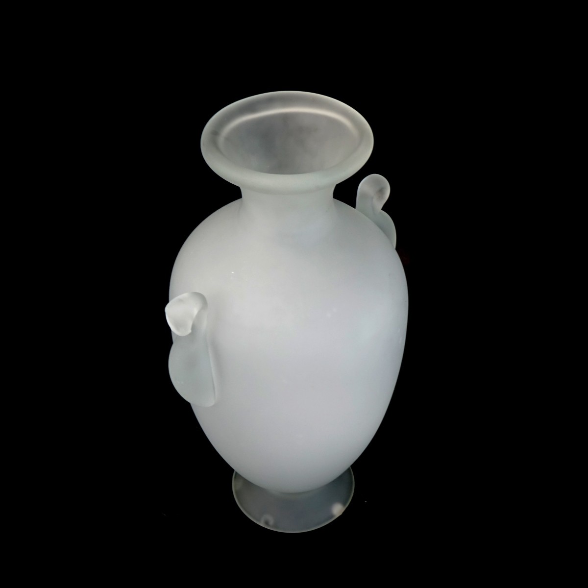 Large Murano Frosted Glass Urn Vase with Handles. labels on surface. Measures 17-1/2" x 11'. Condition: Good condition. Estimate: $200.00 - $400.00 Domestic Shipping: Third party