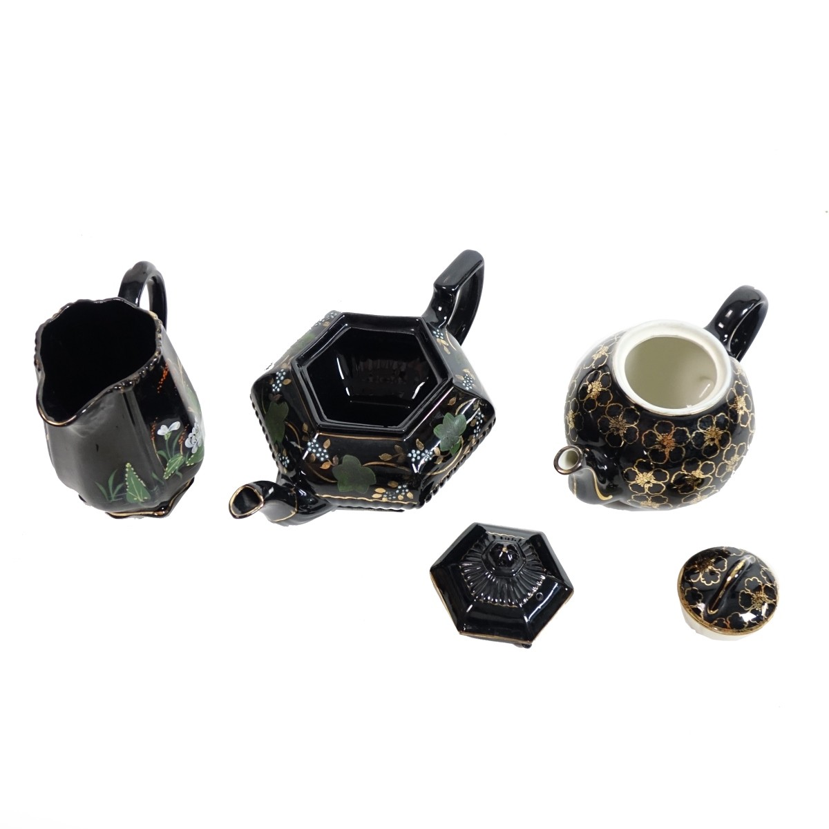 Antique Black Pottery Enamel and Gilt Painted Teapot, Vintage Hall Black and Gilt Painted Porcelain Teapot, along with a Vintage Black Victorian Gilt and Enamel Painted Pottery Jug. Hall teapot is signed otherwise unmarked. Jug measures 6-1/2", Largest teapot measures 6-1/4" x 10-3/4". Condition: Largest teapot has a small area of surface wear at the rim, rubbing on all items otherwise good condition. Estimate: $100.00 - $300.00 Domestic Shipping: $72.00