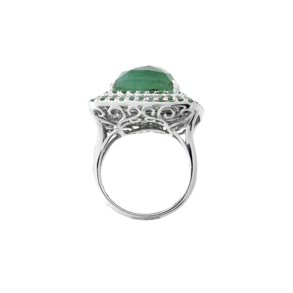 Approx. 12.34 Carat Square Rose Cut Emerald, 2.17 Carat TW Round Brilliant Cut Diamond and 18 Karat White Gold Ring. Further accented with small round cut emeralds. Emerald with vivid color. Diamonds F-G color, VS2 clarity. Stamped 18K 750. Ring size 6-1/2. Approx. weight: 9.48 grams. Condition: Very good condition. Estimate: $3000.00 - $5000.00 Domestic Shipping: $28.00