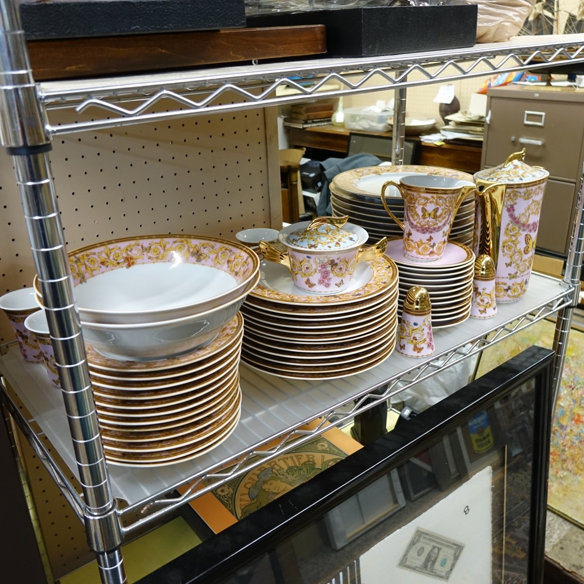 Rutherford Versace Style "Le Jardin De Italy" Porcelain Dinnerware. Includes: (12) plates 10-3/4", (2) serving plates 12-3/4", (12) soup bowls 9", (12) desert plates, (12) cups 3-3/4" x 3-3/8", (12) saucers, (2) bowls, (1) teapot 10", (1) covered sugar bowl, (1) creamer, and (2) shakers. Various marks to the base to include a Rutherford mark or a Versace head with no inscription. Condition: Good condition. This lot has been inspected but may contain further condition issues not listed, sold in As Is condition. Estimate: $200.00 - $600.00 Domestic Shipping: Third party