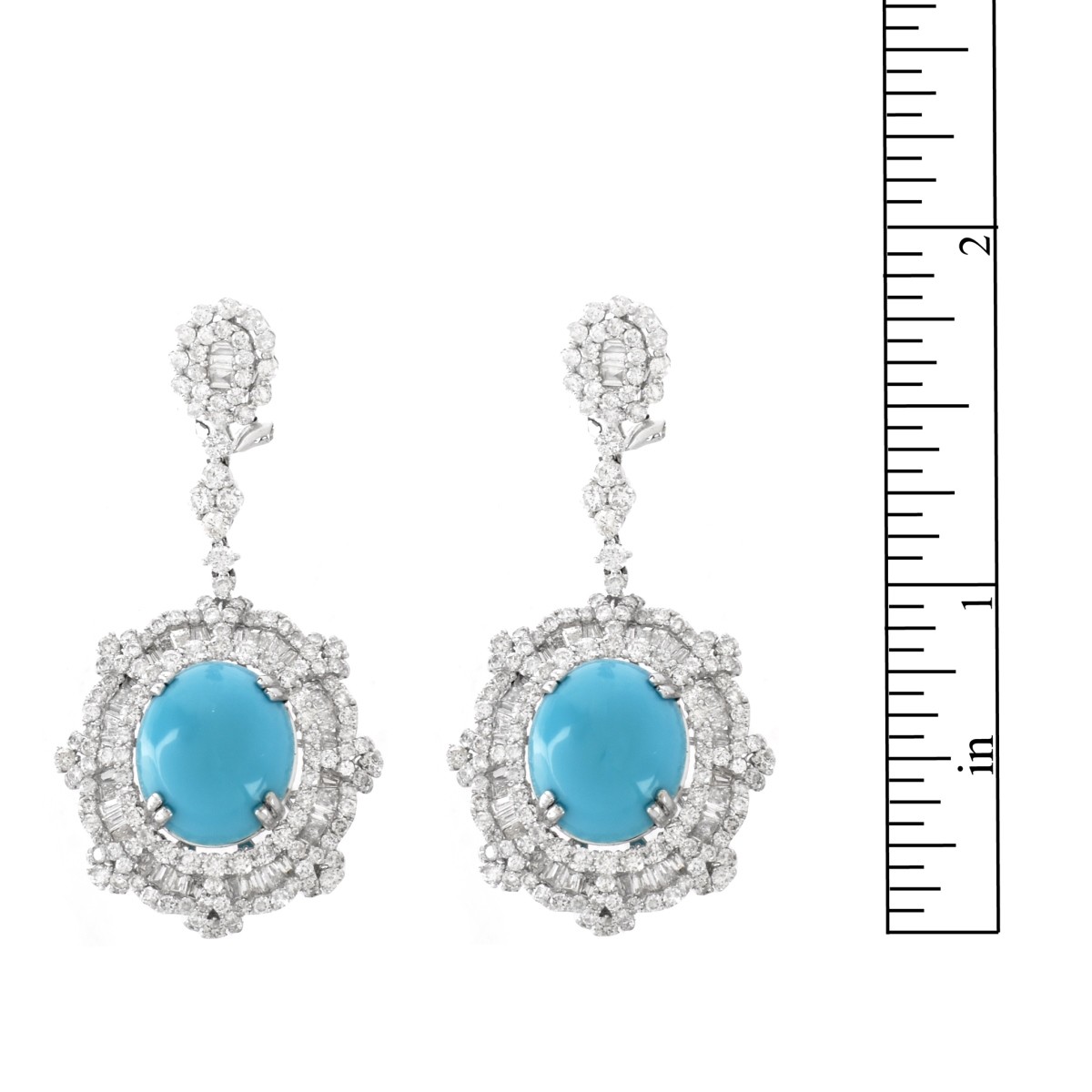 Approx. 5.25 Carat TW Round Brilliant and Baguette Cut Diamond, 11.75 Carat TW Oval Cabochon Persian Turquoise and 18 Karat White Gold Pendant Earrings. Diamonds E-F color, VS clarity. Measure 1-7/8" L, 7/8" W. Approx. weight: 15.64 grams. Condition: Very good condition. Estimate: $3000.00 - $5000.00 Domestic Shipping: $30.00